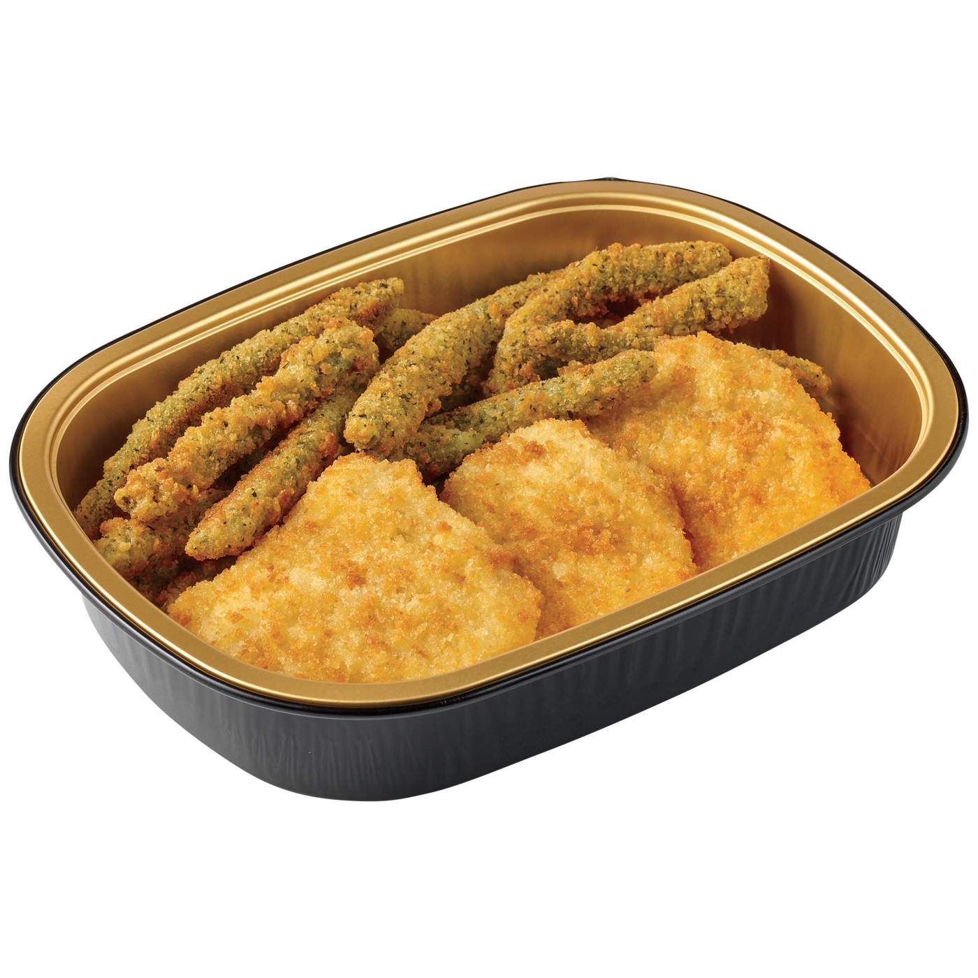 pub style battered cod(cod, wheat flour, corn flour, corn starch, salt, sugar, dextrose, leavening(sodium bicarbonate, citric acid), garlic powder, yeast extract, onion powder, canola oil) parmesan crusted green beans(green beans, wheat flour, yellow corn flour, corn starch, parmesan and romano cheese(MILK, cultures, enzymes (animal), microbial enzymes, salt), salt, spices, sugar, garlic powder, onion powder, parsley, leavening(sodium acid pyrophosphate, sodium bicarbonate), yeast, egg whites, spice extractives, xanthan gum, unsalted butter(cream(MILK), natural flavor), natural flavor, canola oil) contains a bioengineered food ingredientAllergens and safety warnings