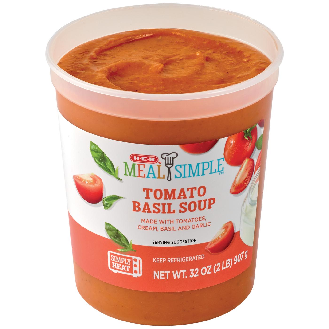 This family-sized Meal Simple by H-E-B Tomato Basil Soup is warm and comforting, especially served with grilled cheese sandwiches. Made with tomatoes, cream, basil and garlic, it has a light and creamy taste. Just heat it up in the microwave or on the stovetop for a satisfying lunch.