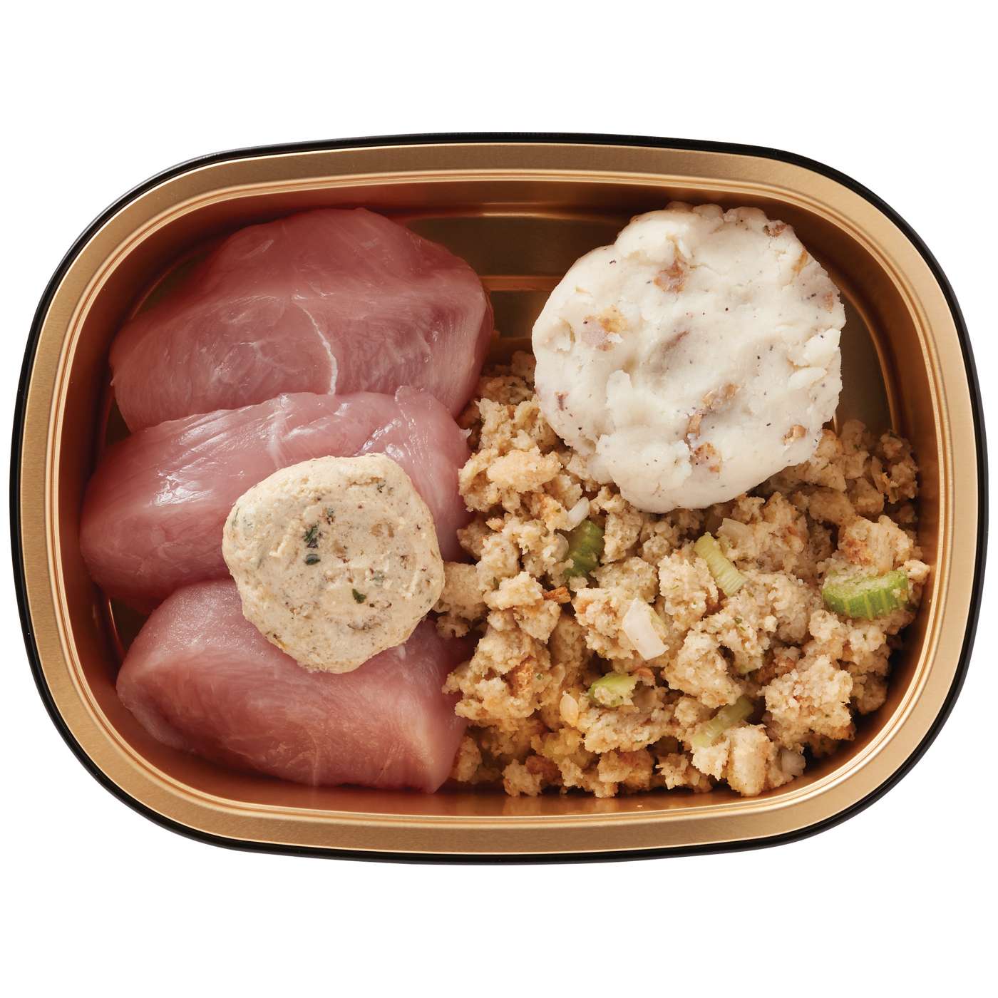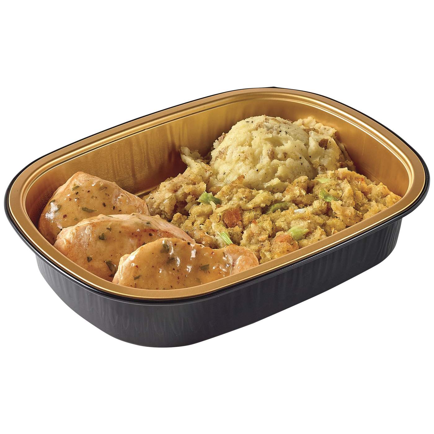 Turkey Tenderloin With Gravy (Turkey Tenderloin, Gravy [Water, Butter, Chicken Base {Maltodextrin, Gelatin, Dried Chicken Broth, Salt, Sugar, Natural Flavor, Cooked Chicken, Onion Powder, Corn Starch, Tomato Powder, Spices, Carrot Powder, Turmeric, Garlic Powder, Corn Oil}, Color, Garlic, Salt, Onion, Brown Sugar, Black Pepper, Corn Starch, Xanthan Gum, Parsley, Sage]), Stuffing (Chicken Broth [Chicken Stock, Contains Less Than 2% Of: Salt, Yeast Extract, Water, Corn Syrup Solids, Flavoring, Chicken Fat, Dehydrated Chicken Broth], Basic Stuffing [Bread Crumbs {Wheat Flour, Whole Wheat Flour, Sugar, Less Than 2% Of: Soybean Oil, Salt, Yeast}, Rendered Chicken Fat, Dehydrated Onion, Torula Yeast, Chicken Broth Flavor {(Chicken Broth, Salt, Flavor), Maltodextrin}, Salt, Cooked Chicken Meat {Cooked Chicken, Natural Flavoring}, Parsley Flakes, Spices, Whey Powder, Sugar, Spice Extractives], Celery, Onions), Mashed Potatoes (Potatoes With Skin, Butter [Sweet Cream, Salt], Milk, Salt, Black Pepper, Spices, Garlic Powder).Allergens and safety warnings