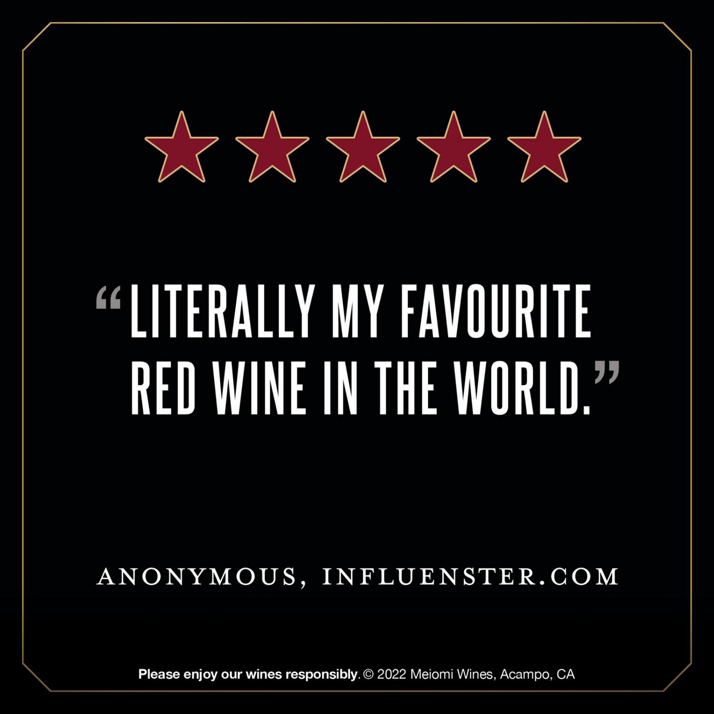 •One 750 mL bottle of Meiomi Cabernet Sauvignon Red Wine containing five 5-oz servings of wine
