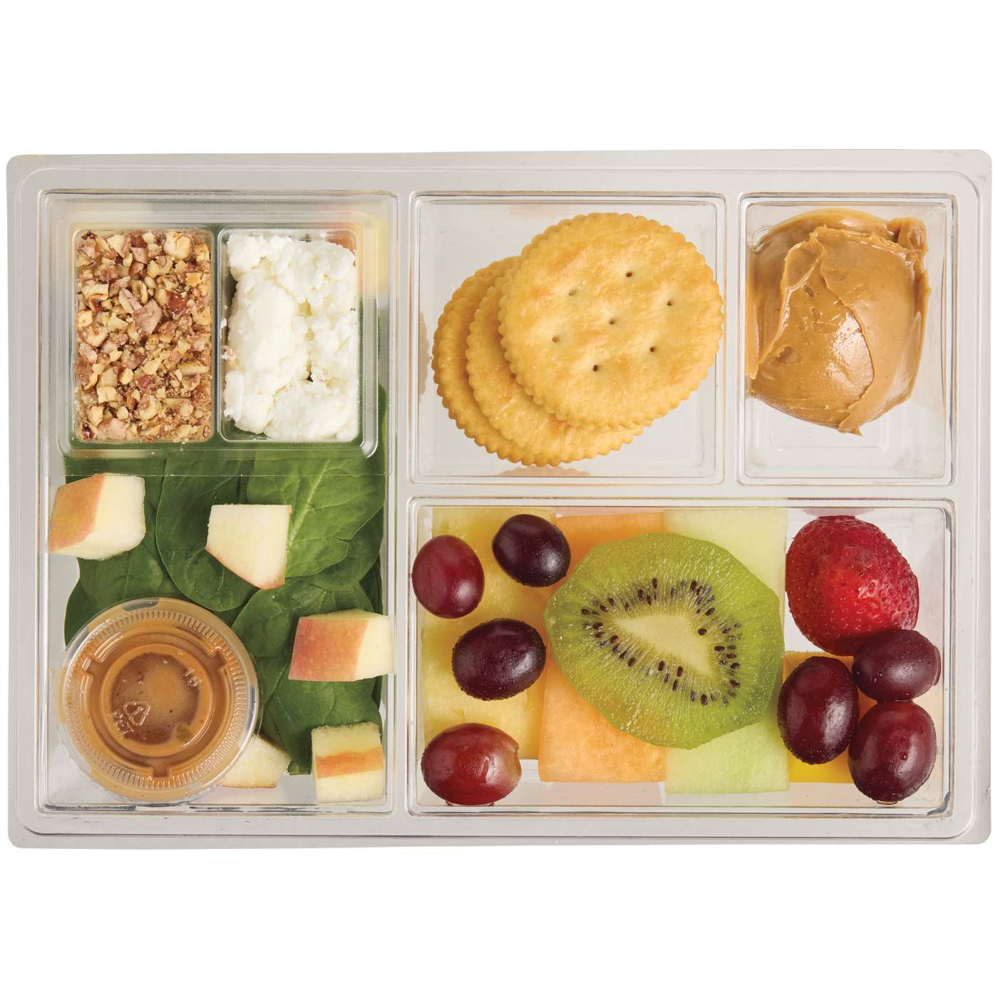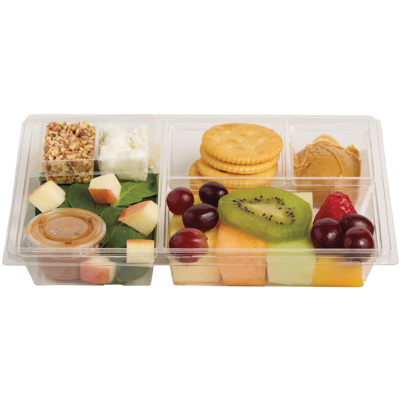 This Mibo Bento Box includes a delightful blend of Cantaloupe, Honeydew, Pineapple, Mango, Strawberry, Grapes, Kiwi, Apple, Peanut Butter, Crackers, with a Spinach salad including Honey Toasted Pecans, Feta Cheese and a Balsamic Vinaigrette.