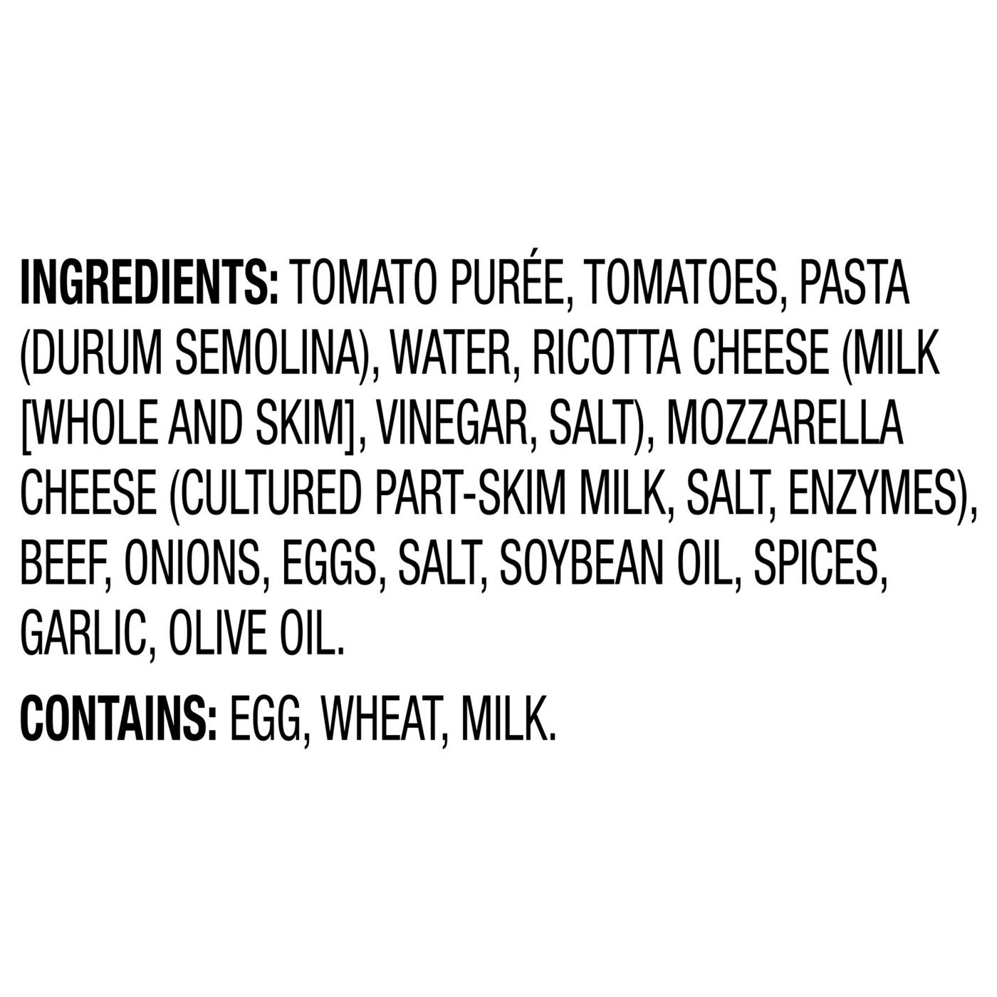 Tomatoes (Tomatoes, Salt), Water, Pasta (Durum Semolina), Ricotta Cheese (Milk [Whole and Skim], Vinegar, Salt), Tomatoes, Mozzarella Cheese (Pasteurized Milk, Cheese Culture, Salt, Enzymes), Beef, Onions, Egg, Soy Oil, Salt, Spices, Garlic, Granulated Garlic, Olive Oil.Allergens and safety warnings
