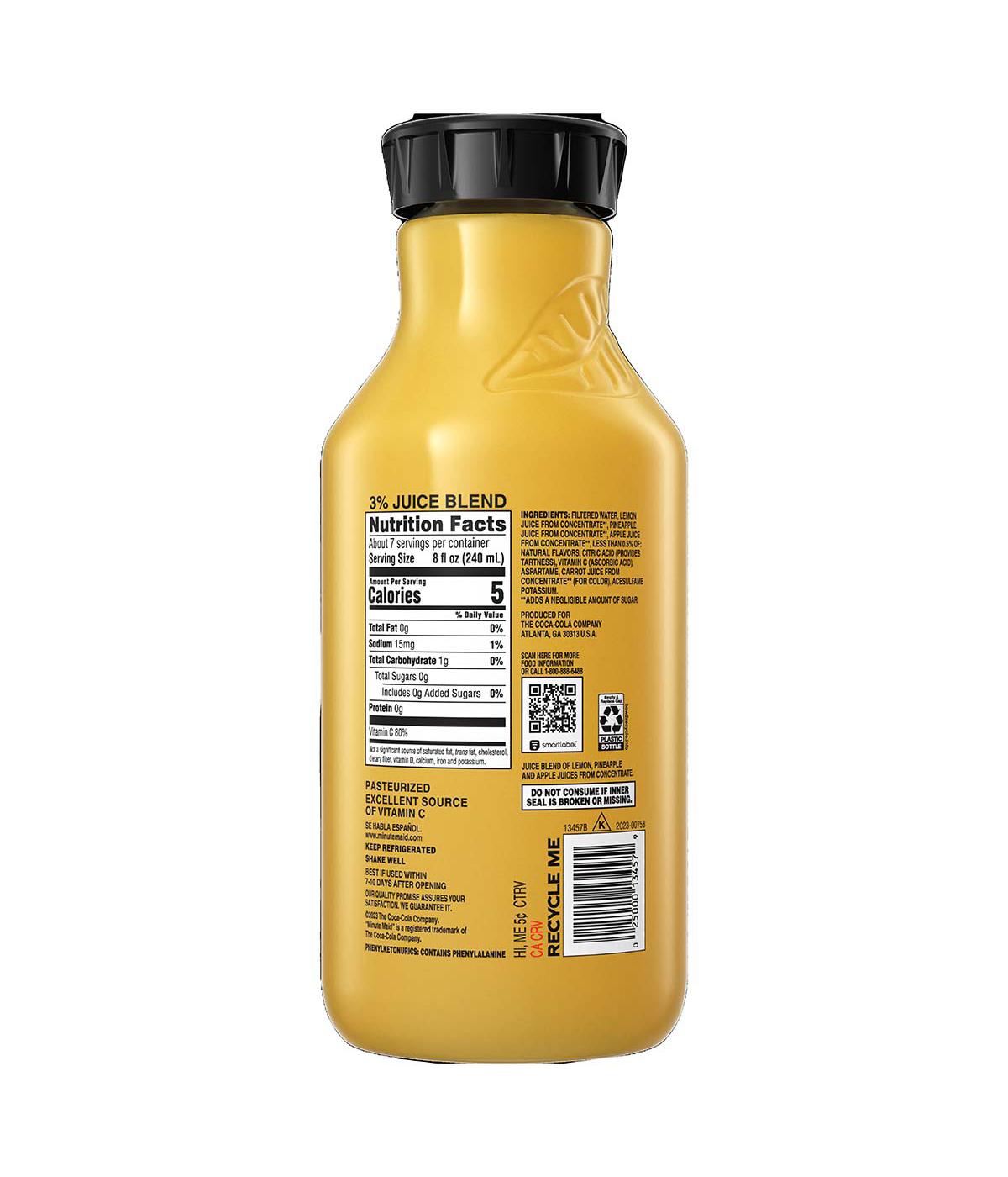 Filtered Water, Lemon Juice from Concentrate**, Pineapple Juice from Concentrate**, Apple Juice from Concentrate**, Less than 0.5% of: Natural Flavors, Citric Acid (Provides Tartness), Vitamin C (Ascorbic Acid), Aspartame, Carrot Juice from Concentrate** (for Color), Acesulfame Potassium. ** Adds a Negligible Amount of Sugar.Allergens and safety warnings