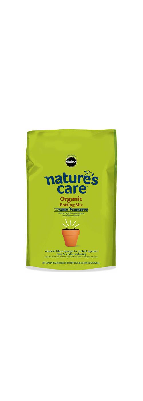Miracle-Gro Natures Care Organic Potting Mix absorbs like a sponge to protect against over and under watering. Thirsty plants are mopey plants and keeping them hydrated starts from the ground up. The moisture holding power comes from nature, with cool things like yucca and coir.