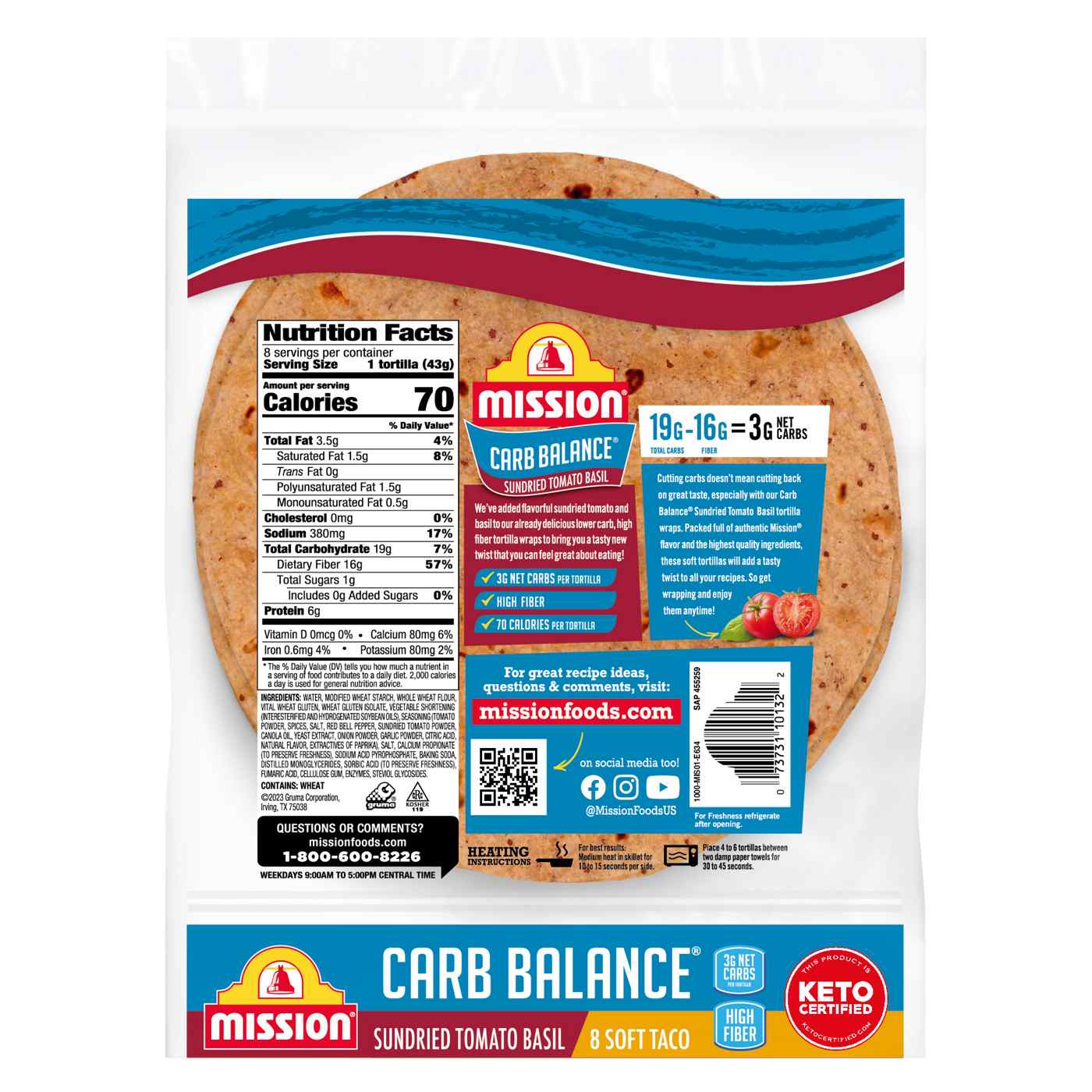 Didn't think a low carb, great tasting flavored tortilla was possible? Think again. Cutting carbs just got tastier. Try our new Carb Balance Sundried Tomato Basil Tortilla Wraps. Packed with zesty sundried tomatoes and fresh basil flavors, these wraps strike the perfect balance between carbs and cravings. Includes one 8 count pack of Mission Super Soft Carb Balance Sundried Tomato Basil Tortilla Wraps.- One 8-count package of Mission Carb Balance Sundried Tomato Basil Tortilla Wraps- Cutting carbs doesn't mean cutting back on great taste, our keto friendly tortillas are packed with flavor while only containing 3g of net carbohydrates per serving- We've combined flavorful sun-dried tomato basil with our already delicious low carb tortilla wraps for a new twist on eating healthy- Enrich your diet with a tortilla high in fiber and free from trans fat as well as cholesterol- At only 80 calories per tortilla, these versatile spinach herb wraps can be the star of any meal or snack
