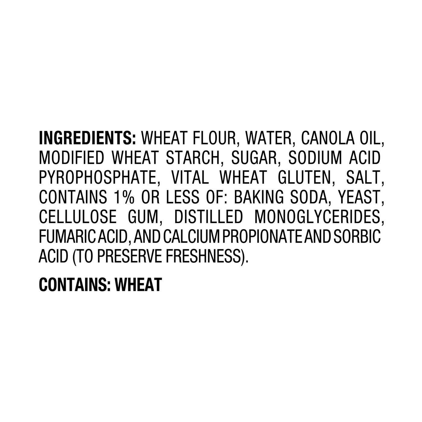 Wheat Flour, Water, Canola Oil, Modified Wheat Starch, Sugar, Sodium Acid Pyrophosphate, Vital Wheat Gluten, Salt, Contains 1% or Less of: Baking Soda, Yeast, Cellulose Gum, Distilled Monoglycerides, Fumaric Acid, and Calcium Propionate and Sorbic Acid (to Preserve Freshness).Allergens and safety warnings