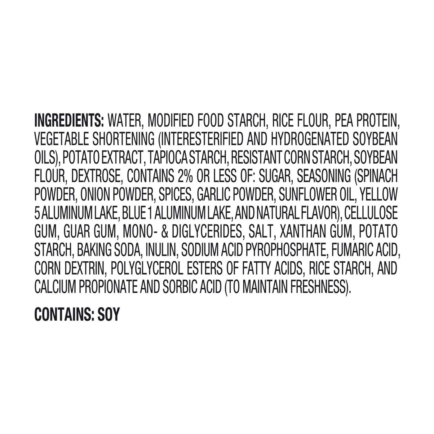 Water, Modified Food Starch, Rice Flour, Pea Protein, Resistant Corn Starch, Vegetable Shortening (Interesterified and Hydrogenated Soybean Oils), Potato Extract, Tapioca Starch, Potato Starch, Sucralose, Sugar, Cellulose Gum, Guar Gum, Xanthan Gum, Salt, Monoglycerides, Seasoning (Spinach Powder, Onion Powder, Spices, Garlic Powder, Sunflower Oil, Yellow 5 Aluminum Lake, Blue 1 Aluminum Lake, and Natural Flavor), Dextrose, Calcium Propionate (to Preserve Freshness), Baking Soda, Sodium Acid Pyrophosphate, Tapioca Flour, Millet Flour, Fumaric Acid, Inulin, Sorbic Acid (to Preserve Freshness).Allergens and safety warnings