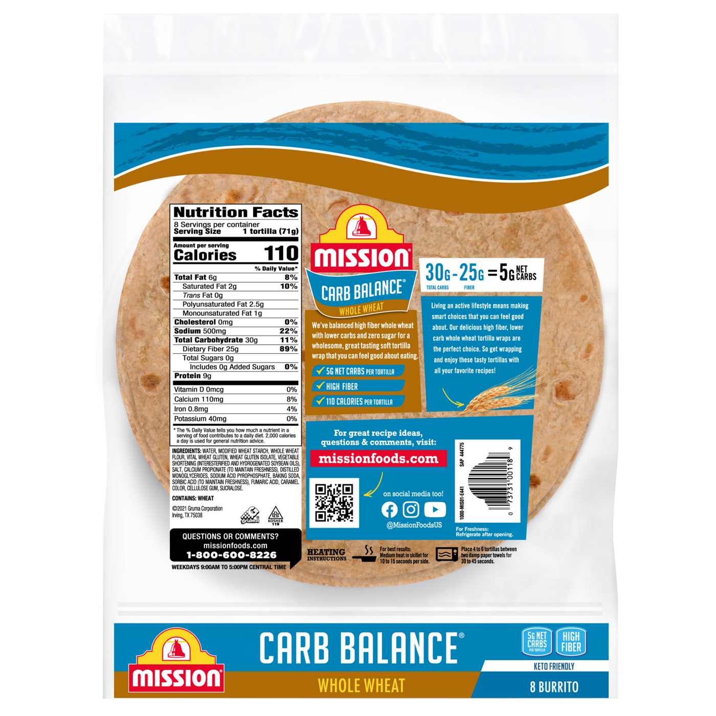 Mission Carb Balance Burrito Whole Wheat Tortillas may be low in carbs, but they still take great taste to the extreme. Our tortillas have only 8g of net carbohydrates per serving and are an excellent source of fiber, so they're a great addition to all of your favorite low carb recipes. We also craft our tortillas without any cholesterol, sugars, or trans fat, and we ensure each batch has a super-soft texture that tastes homemade. Though they're versatile enough for any recipe, try our tortillas filled with sliced turkey, sharp cheddar, and apple-arugula salad for a quick and delicious meal. Includes one 8-count package of Mission Carb Balance Burrito Whole Wheat Tortillas.- One 8-count package of Mission Carb Balance Whole Wheat Flour Burrito Tortillas- We've balanced high fiber whole wheat with lower carbs and zero sugar for a wholesome great tasting soft tortilla wrap- Enrich your diet with a tortilla free from trans fat and cholesterol- With only 5g of net carbs per tortilla and no sugar, you can feel good using these tasty tortillas anytime- These versatile tortillas make a great addition to any of your favorite low carb recipes