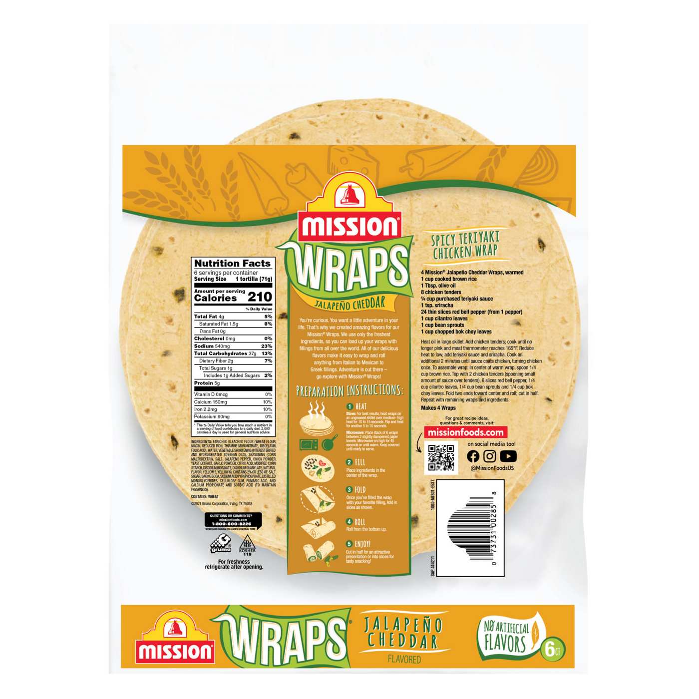Bring the heat when you're cooking up your next culinary creation with our Mission Jalapeño Cheddar Wrap. Using only the freshest of ingredients and no artificial flavors, ours wraps are perfect for any new recipe you want to try, or the perfect way to spice up your favorites. Easy to wrap and roll anything from Italian to Mexican to Greek fillings. Includes one 6 count pack of Mission Jalapeno Cheddar Wraps.- One 6-count package of Mission Jalapeno Cheddar Wraps- Wrap up your shopping list with our hot and spicy jalapeño cheddar wraps- Each wrap contains no artificial colors, flavors, trans fat, or cholesterol- These certified kosher wraps are quick to heat and easy to fill, fold, and roll- Versatile wraps that can be used in all kinds of meals or snacks