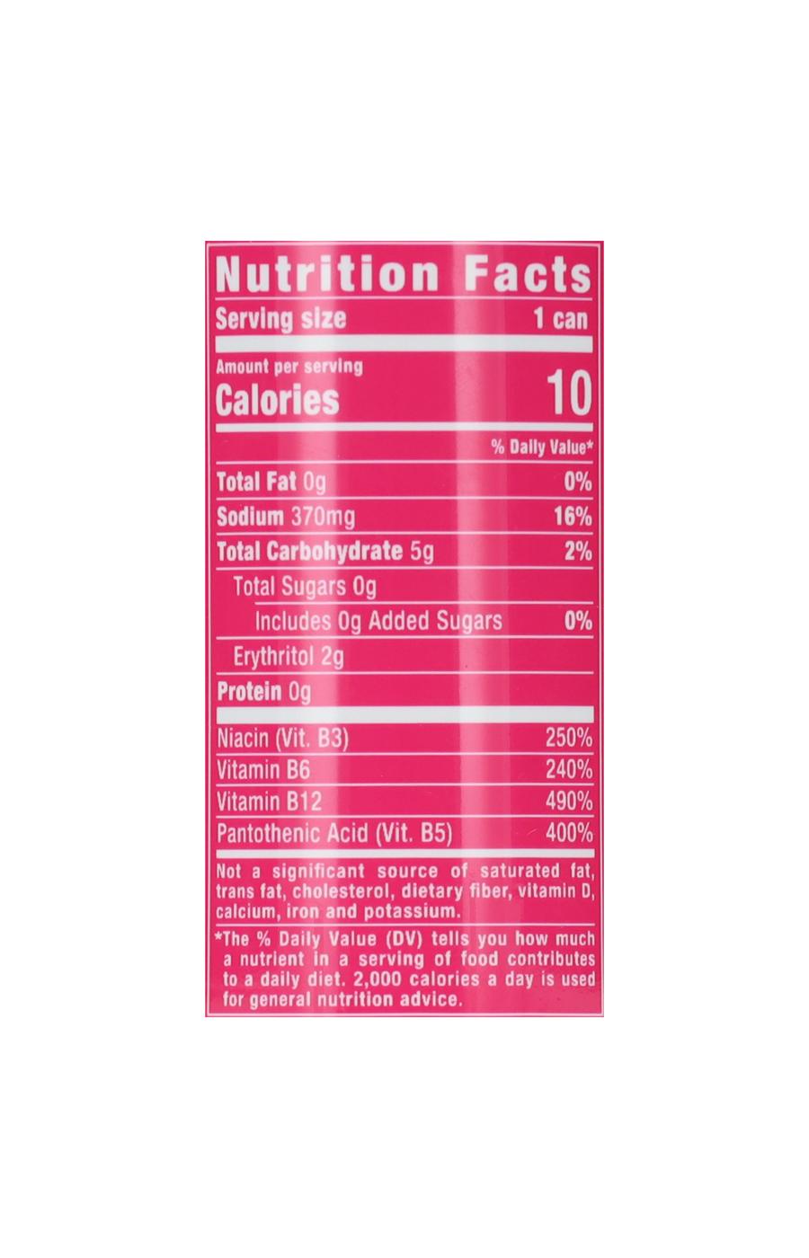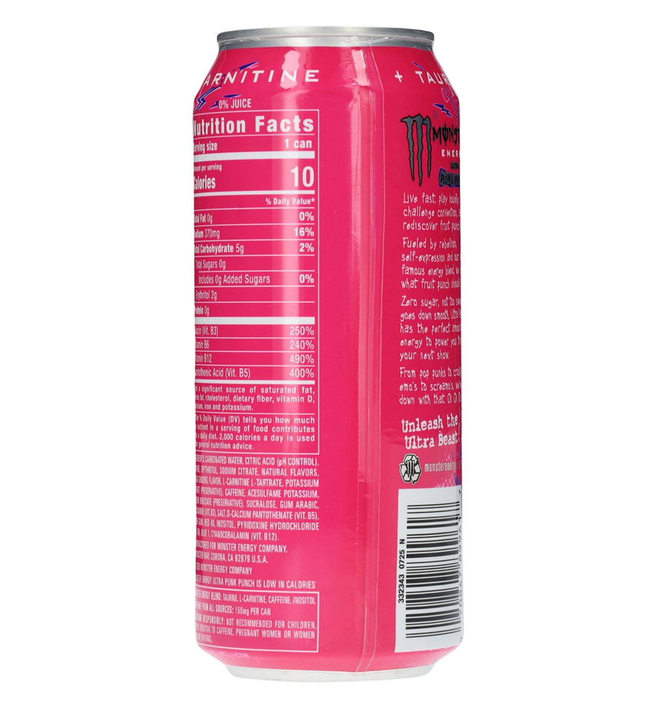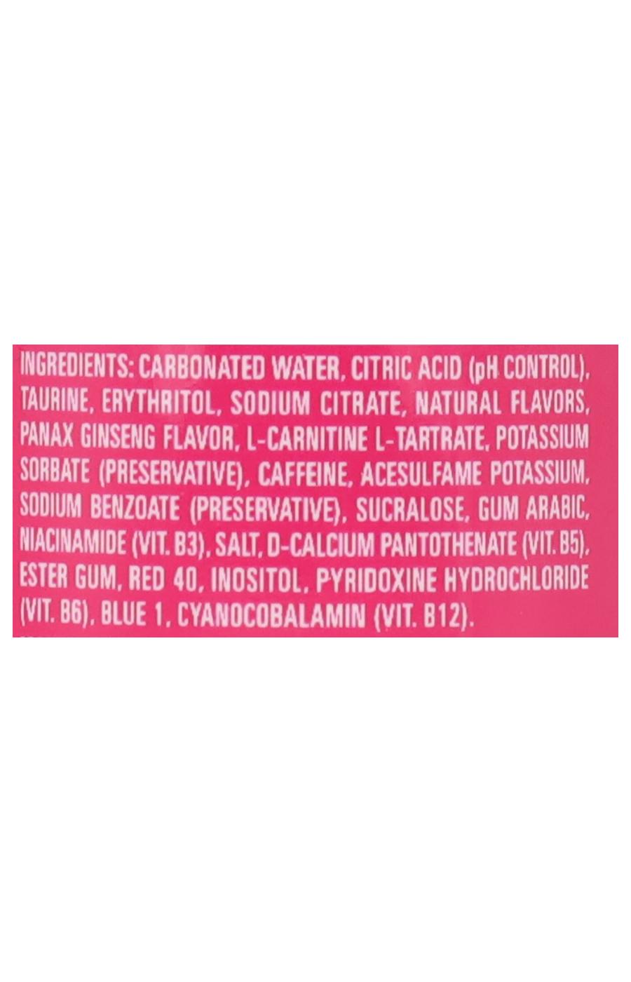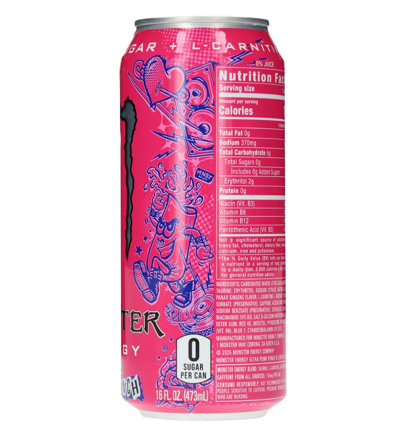Monster Energy Blend: Taurine, L Carnitine, Caffeine, Inositol. Carbonated Water, Citric Acid (pH Control), Taurine, Erythritol, Sodium Citrate, Natural Flavors, Panax Ginseng Flavor, L-Carnitine L-Tartrate, Potassium Sorbate (Preservative), Caffeine, Acesulfame Potassium, Sodium Benzoate (Preservative), Sucralose, Gum Arabic, Niacinamide (Vit. B3), Salt, D-Calcium Pantothenate (Vit. B5), Ester Gum, Red 40, Inositol, Pyridoxine Hydrochloride (Vit. B6), Blue 1, Cyanocobalamin (Vit. B12).Allergens and safety warnings