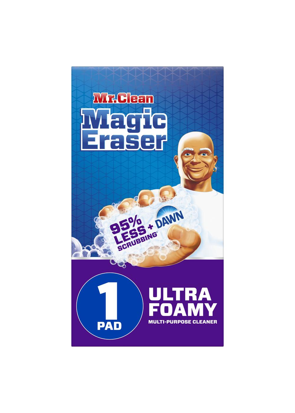 Mr. Clean Magic Eraser Ultra Foamy multi surface cleaner pad combines the cleaning power of Dawn with the scrubbing power of Magic Eraser for a clean like you've never seen. Just wet, squeeze, and let the foam help you clean messes around your home - no more sponges or other cleaning products needed. The cleaning micro-scrubbers with added foaming cleanser cut through the toughest messes with 95% less scrubbing. This all purpose cleaner works on tough and tricky messes all over the house, even outdoors. Clean sticky messes in the microwave, soap scum in the shower, rings in the bathtub, greasy counters, glass stovetops, patio furniture, permanent marker, wine stains, and more. Use as a shoe cleaner, too.