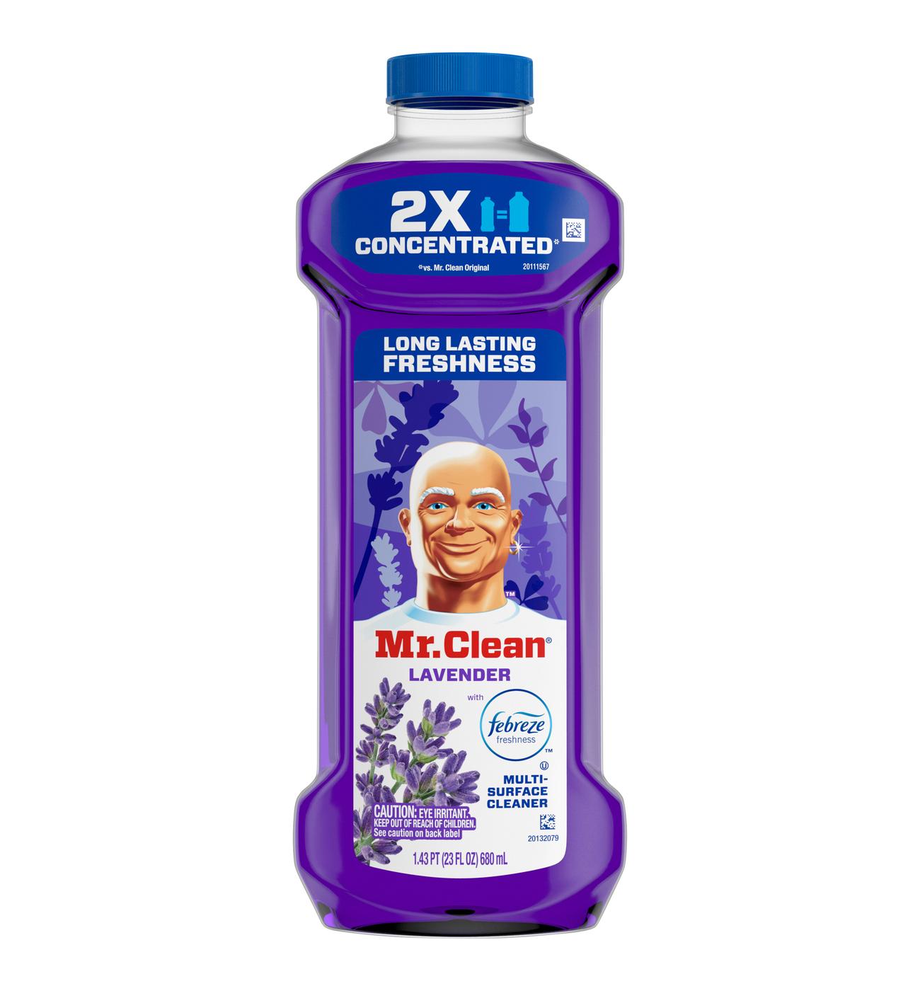 Mr. Clean’s 2X Concentrated* Liquid formula muscles through 100% of dirt and grease for powerful, multi surface cleaning. This floor cleaner for mopping is great for cleaning linoleum, tile & hardwood floors**. Use Mr. Clean all purpose cleaner all around the house to clean toilets, sinks, and bathtubs. This multi surface cleaner even works outside on garbage cans, doors, and more. It makes cleaning your house that much easier and leaves the long lasting freshness of Febreze Lavender scent behind. Add Mr. Clean to your arsenal of cleaning supplies today!