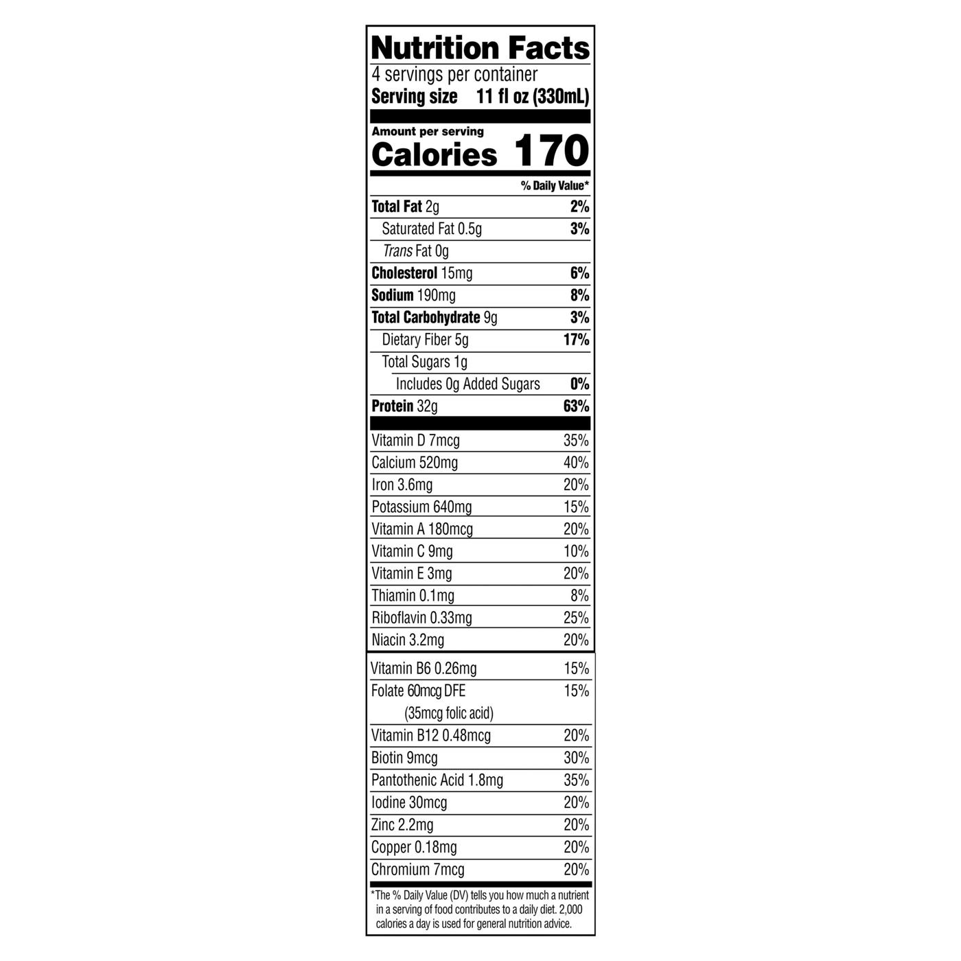 Water, Milk Protein Isolate, Calcium Caseinate (Milk Derivative), Contains Less than 2% of Sodium Caseinate (Milk Derivative), Cocoa (Processed with Alkali), Soluble Corn Fiber, Natural and Artificial Flavor, High Oleic Sunflower Oil, Cellulose Gel, Inulin, Tripotassium Phosphate, Potassium Chloride, Potassium Phosphate, Sodium Polyphosphates, Cellulose Gum, Sucralose, Carrageenan, Acesulfame Potassium, Salt, Ascorbic Acid (Vitamin C), Sodium Citrate, Ferric Pyrophosphate, Calcium Phosphate, Vitamin E Acetate, Niacinamide, Zinc Oxide, Copper Gluconate, Calcium Pantothenate, Vitamin A Palmitate, Pyridoxine Hydrochloride (Vitamin B6), Vitamin D3, Thiamin Mononitrate (Vitamin B1), Riboflavin, Folic Acid, Potassium Iodide, Chromium Chloride, Biotin, Cyanocobalamin (Vitamin B12).Allergens and safety warnings