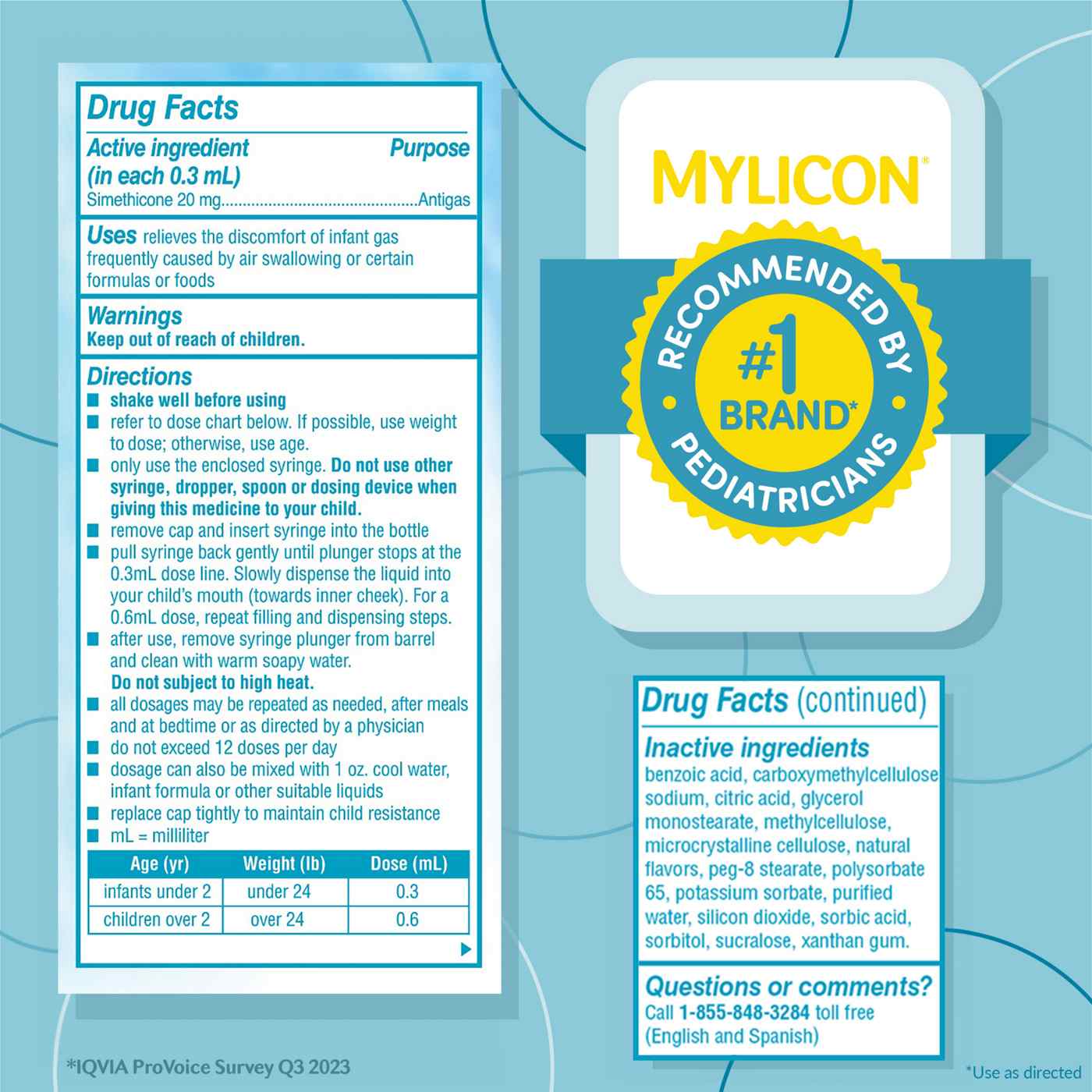 (in each 0.3 mL) Active Ingredients: Simethicone (20 mg), Antigas. Inactive Ingredients: Benzoic Acid, Carboxymethylcellulose Sodium, Citric Acid, Glycerol Monostearate, Methylcellulose, Microcrystalline Cellulose, Natural Flavors, PEG-8 Stearate, Polysorbate 65, Potassium Sorbate, Purified Water, Silicon Dioxide, Sorbic Acid, Sorbitol, Sucralose, Xanthan Gum.Allergens and safety warnings