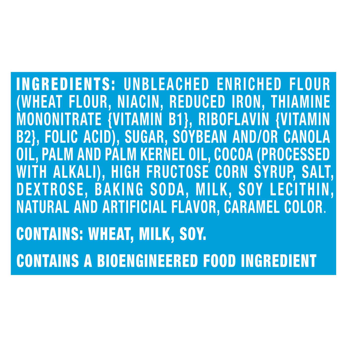Unbleached Enriched Flour (Wheat Flour, Niacin, Reduced Iron, Thiamine Mononitrate {Vitamin B1}, Riboflavin {Vitamin B2}, Folic Acid), Sugar, Soybean And/Or Canola Oil, Palm And Palm Kernel Oil, Cocoa (Processed With Alkali), High Fructose Corn Syrup, Salt, Dextrose, Baking Soda, Milk, Soy Lecithin, Natural And Artificial Flavor, Caramel Color.Contains: Wheat, Milk, Soy.Allergens and safety warnings