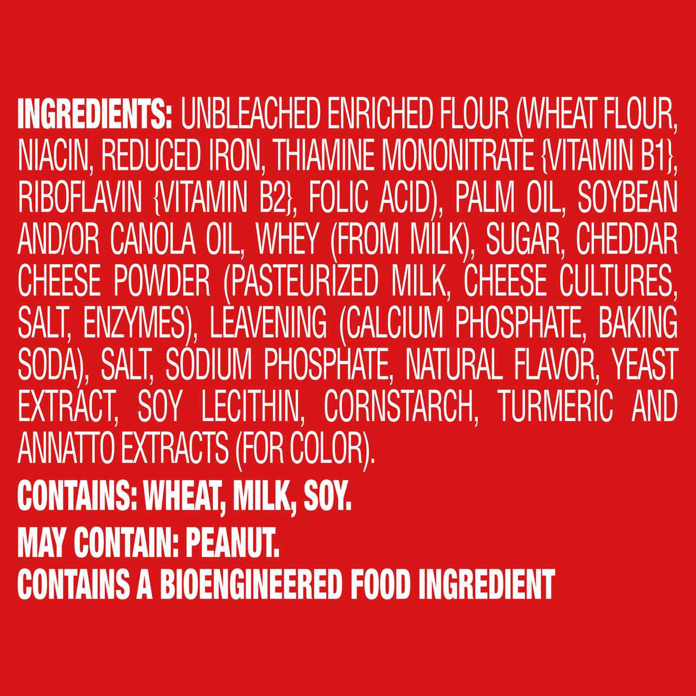 Ingredients: Unbleached Enriched Flour (Wheat Flour, Niacin, Reduced Iron, Thiamine Mononitrate [Vitamin B1], Riboflavin [Vitamin B2], Folic Acid), Palm Oil, Soybean And/Or Canola Oil, Whey (From Milk), Sugar, Cheddar Cheese Powder (Pasteurized Milk, Cheese Cultures, Salt, Enzymes), Leavening (Calcium Phosphate, Baking Soda), Salt, Sodium Phosphate, Natural Flavor, Yeast Extract, Soy Lecithin, Cornstarch, Turmeric And Annatto Extracts (For Color).Contains: Wheat, Milk, Soy.May Contain: Peanut.Allergens and safety warnings