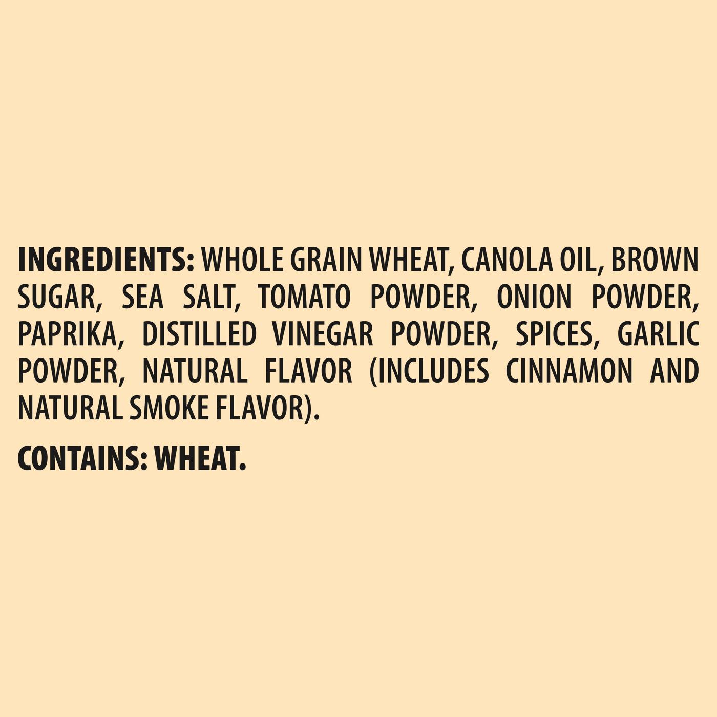 Whole Grain Wheat, Canola Oil, Brown Sugar, Sea Salt, Tomato Powder, Onion Powder, Paprika, Distilled Vinegar Powder, Spices, Garlic Powder, Natural Flavor (Includes Cinnamon And Natural Smoke Flavor). Contains: Wheat.Allergens and safety warnings