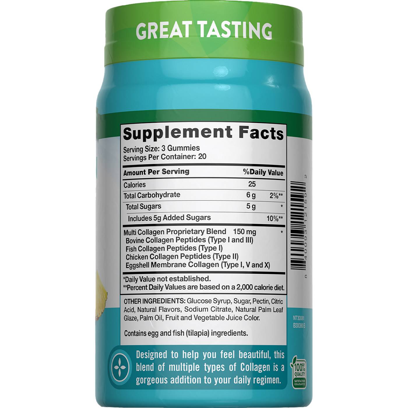 Multi Collagen Proprietary Blend: Bovine Collagen Peptides (Type I and III), Fish Collagen Peptides (Type I), Chicken Collagen Peptides (Type II), Eggshell Membrane Collagen (Type I, V and X). Other Ingredients: Glucose Syrup, Sugar, Pectin, Citric Acid, Natural Flavors, Sodium Citrate, Natural Palm Leaf Glaze, Palm Oil, Fruit and Vegetable Juice Color.Allergens and safety warnings
