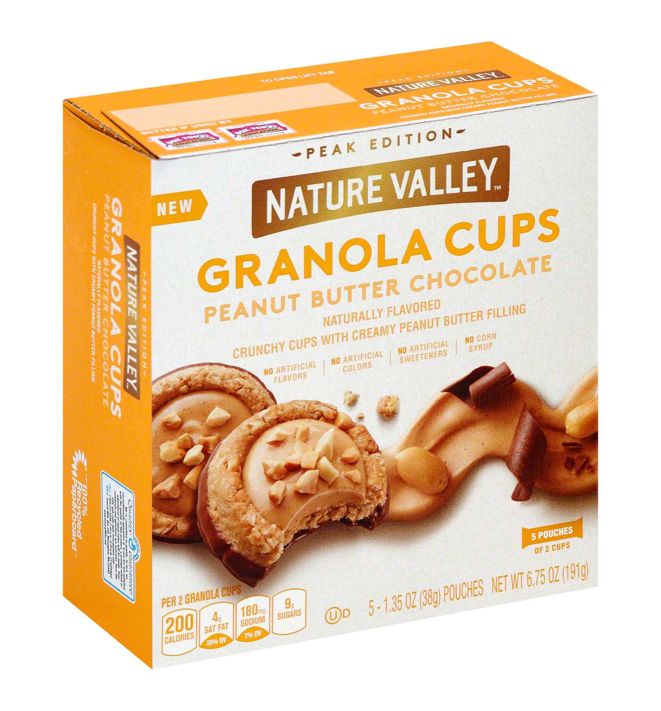 Peak edition. 5 pouches of 2 cups. Crunchy cups with creamy peanut butter filling. Naturally flavored. New. No artificial flavors. No artificial colors. No artificial sweeteners. No corn syrup. Per 2 Granola Cups: 200 calories; 4 g sat fat (20% DV); 180 mg sodium (7% DV); 9 g sugars. Box Tops for Education. Since 1880. Quality & Guarantee: We're committed to quality. In fact, we unconditionally guarantee it. If you are not satisfied with the quality of this product, a prompt refund or adjustment of equal value will be made. 100% recycled paperboard. Carbohydrate Choices: 1. Partially produced with genetic engineering.