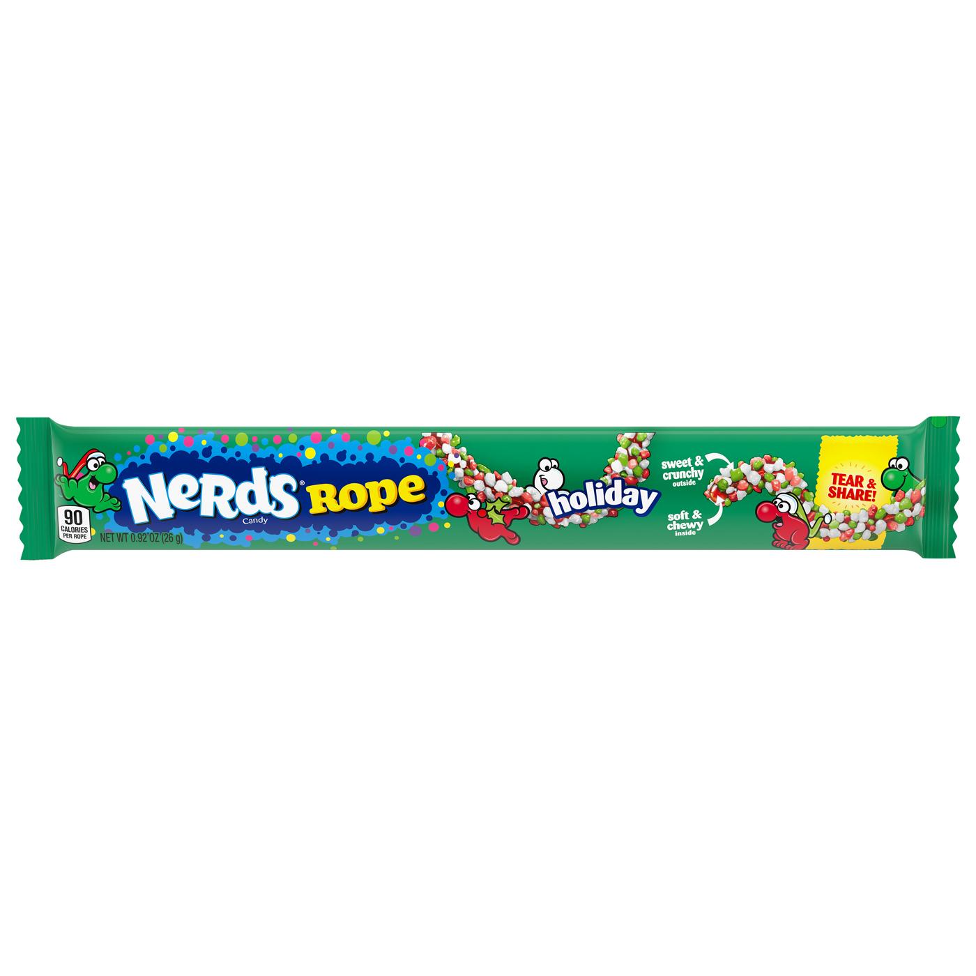Holiday Nerds on a chewy, fruity string. Those sweet little sparks, all together they swing. A tasty rope, packed with crunchy, sweet Nerds. A candy so tasty, there aren't even words.