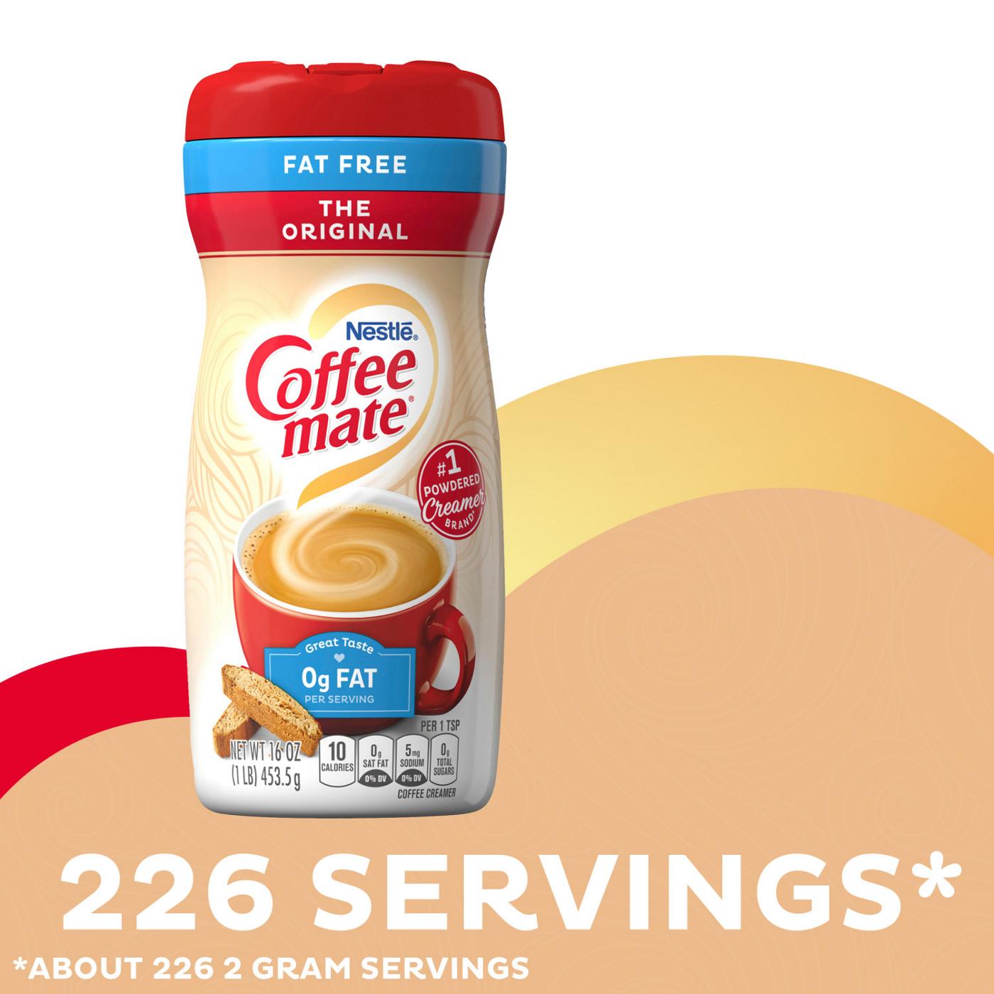 Nestle Coffee mate Original Fat Free Powdered Coffee Creamer is an ideal way to create a delicious cup of coffee perfection. Smooth and rich, this Coffee mate original creamer delivers a warm, rich flavor that transforms every drinking experience. Coffee mate fat free creamer is also lactose free, gluten free and non dairy. Coffee creamer powder makes it easy to pour, stir and enjoy the exact amount into your prepared coffee for a delicious, flavorful cup. This classic flavored coffee creamer is the perfect way to wake up your coffee, whether it's your morning cup or an afternoon pick-me-up. Store Coffee mate powder creamer in a cool, dry place.