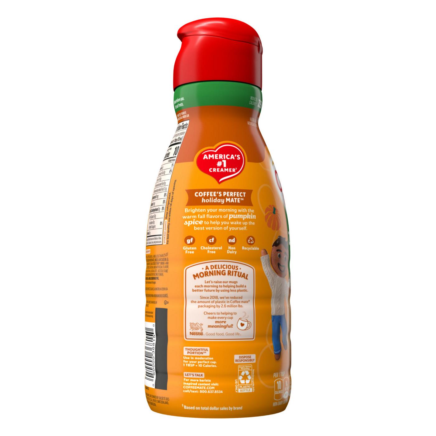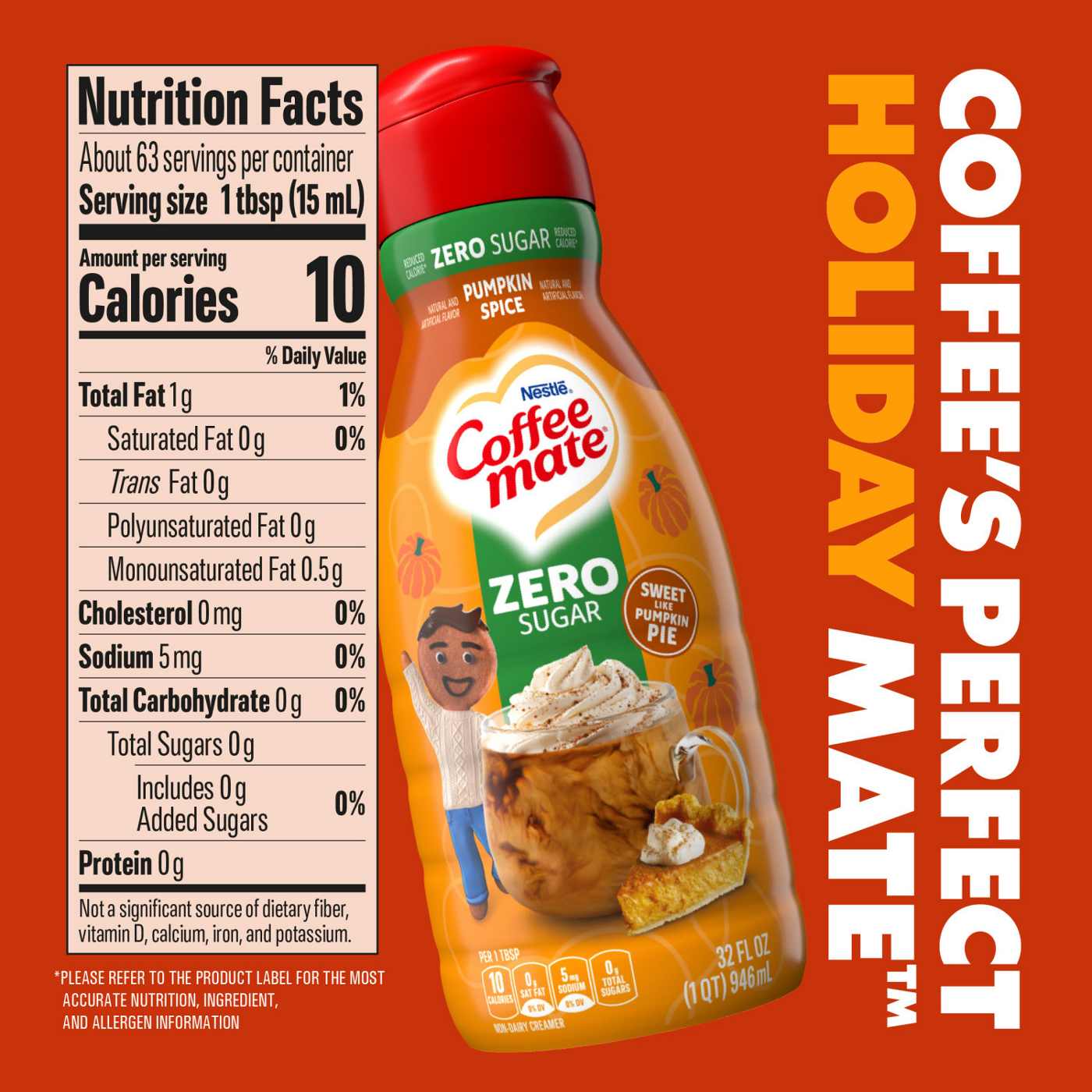 • FOR THE LOVE OF COFFEE: Ditch your boring coffee routine and upgrade your brew game with our Coffee mate Pumpkin Spice Flavored Zero Sugar Coffee Creamer. We’ve been working on our recipes since 1961, so we know what we’re doing when it comes to our flavored coffee creamers• ICONICALLY GLUTEN-FREE WITH ZERO SUGAR: We’re all about creating tasty creamers that everyone can enjoy. Cheers to inclusive indulgence with our gluten-free, cholesterol-free flavored creamer for coffee with zero sugar• HOT, ICED, OR MIXED: Our zero sugar creamer is your coffee’s new BFF — We’re here for your coffee mug, your cup and your martini glass. Add our pumpkin spice flavored coffee creamer any time you’re looking to sweeten up your cup• MVP OF CREAMERS: Whoever said they didn’t like coffee creamer clearly hasn’t tried Coffee mate. Make your coffee goals a reality with our zero sugar creamer• KEEP IT CHILL: Keep your Coffee mate creamer chilled for that perfect coffee flavor. Pop it in the fridge after opening and use your zero sugar creamer within 14 days, if it even lasts that long• EVERY SIP COUNTS: Cheers to a brighter tomorrow with every mug! Our zero sugar coffee creamer comes in recyclable packaging