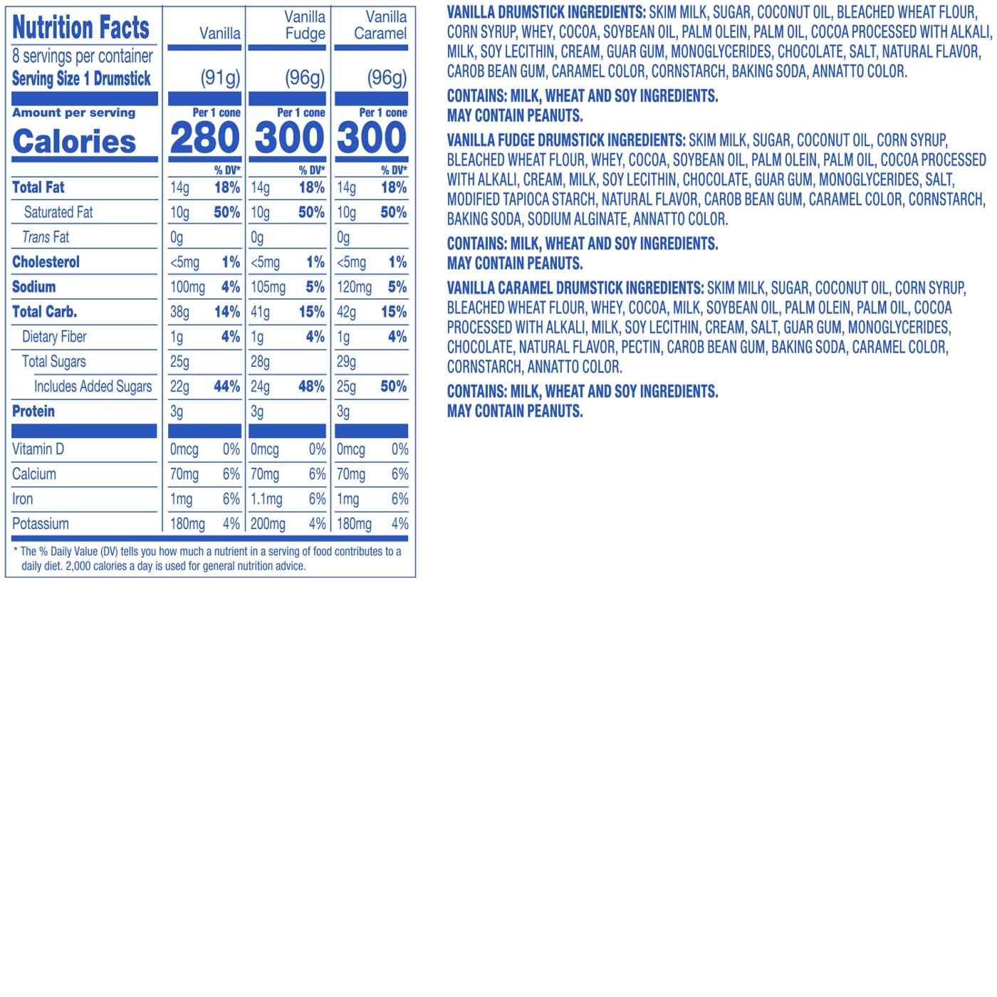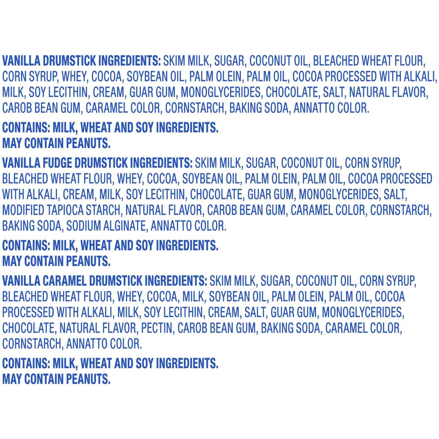 Vanilla: Skim Milk, Sugar, Coconut Oil, Corn Syrup, Bleached Wheat Flour, Whey, Cocoa, Soybean Oil, Palm Olein, Palm Oil, Wheat Flour, Cocoa Processed with Alkali, Milk, Soy Lecithin, Cream, Guar Gum, Monoglycerides, Chocolate, Salt, Carob Bean Gum, Natural Flavor, Caramel Color, Cornstarch, Baking Soda, Annatto Color. Vanilla Fudge: Skim Milk, Sugar, Coconut Oil, Corn Syrup, Bleached Wheat Flour, Whey, Cocoa, Soybean Oil, Palm Olein, Palm Oil, Cocoa Processed with Alkali, Cream, Wheat Flour, Milk, Soy Lecithin, Chocolate, Guar Gum, Monoglycerides, Salt, Modified Tapioca Starch, Carob Bean Gum, Natural Flavor, Caramel Color, Cornstarch, Baking Soda, Sodium Alginate, Annatto Color. Vanilla Caramel: Skim Milk, Sugar, Coconut Oil, Corn Syrup, Bleached Wheat Flour, Whey, Milk, Cocoa, Soybean Oil, Palm Olein, Palm Oil, Wheat Flour, Cocoa Processed with Alkali, Soy Lecithin, Cream, Salt, Guar Gum, Monoglycerides, Chocolate, Pectin, Carob Bean Gum, Natural Flavor, Baking Soda, Caramel Color, Cornstarch, Annatto Color.Allergens and safety warnings