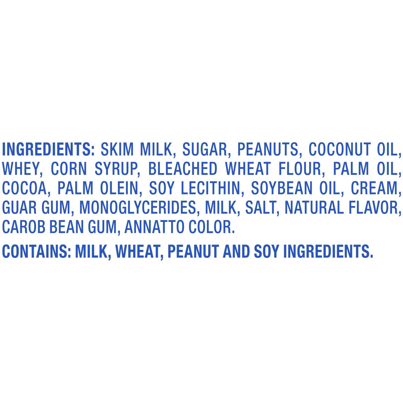 Skim Milk, Sugar, Peanuts, Coconut Oil, Corn Syrup, Bleached Wheat Flour, Whey, Palm Olein, Cocoa, Palm Oil and/or Soybean Oil, Soy Lecithin, Cream, Guar Gum, Monoglycerides, Salt, Carob Bean Gum, Natural Flavor, Milk, Annatto Color.Allergens and safety warnings