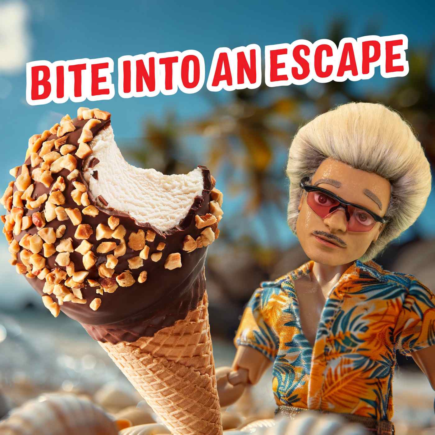 • Crispy sugar cone with creamy vanilla center and rich chocolatey coating with roasted peanuts