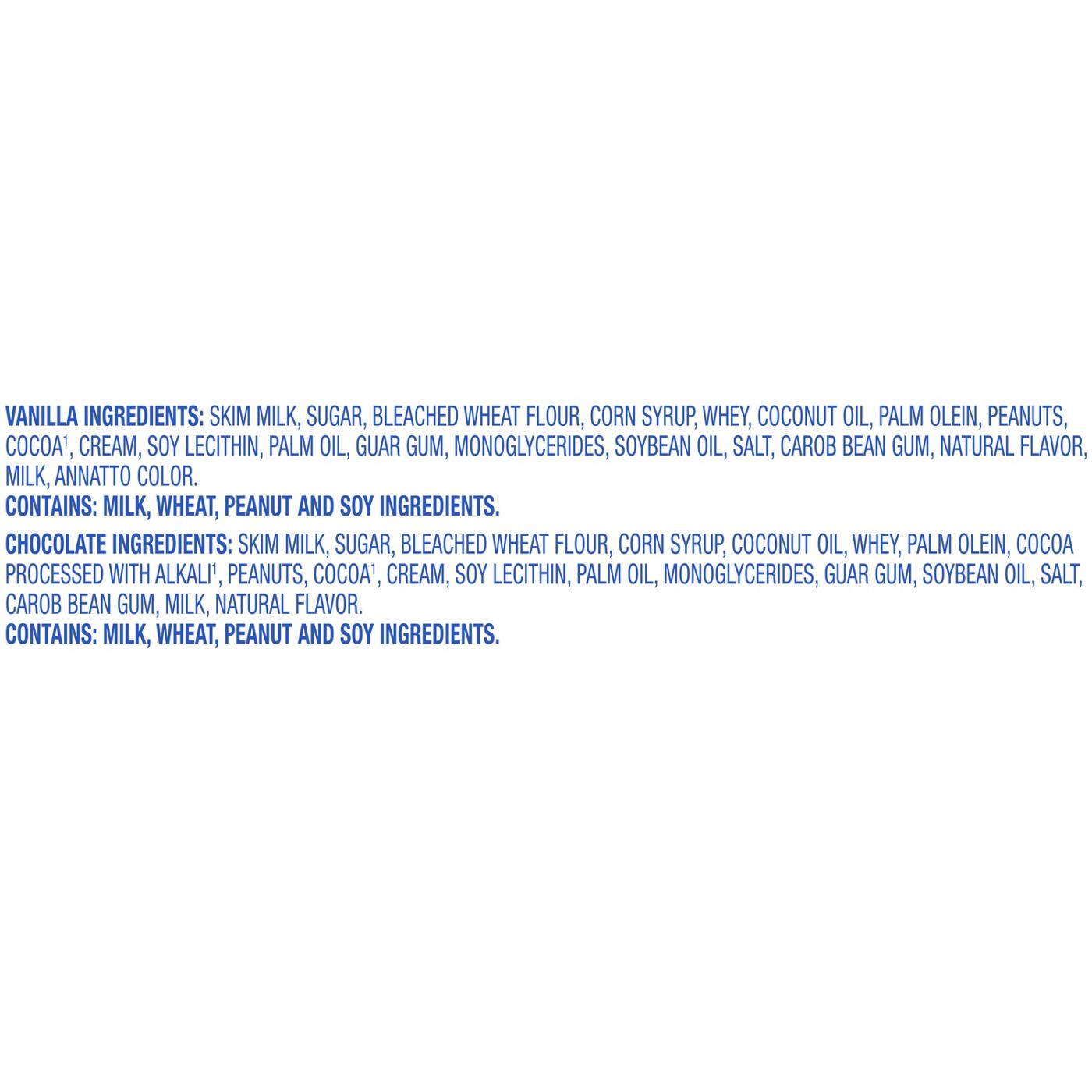 Vanilla: Skim Milk, Sugar, Bleached Wheat Flour, Corn Syrup, Whey, Coconut Oil, Palm Olein, Peanuts, Cocoa, Cream, Soy Lecithin, Palm Oil, Guar Gum, Monoglycerides, Soybean Oil, Salt, Carob Bean Gum, Natural Flavor, Milk, Annatto Color. Chocolate: Skim Milk, Sugar, Bleached Wheat Flour, Corn Syrup, Coconut Oil, Whey, Palm Olein, Cocoa Processed with Alkali, Peanuts, Cocoa, Cream, Soy Lecithin, Palm Oil, Monoglycerides, Guar Gum, Soybean Oil, Salt, Carob Bean Gum, Milk, Natural Flavor.Allergens and safety warnings