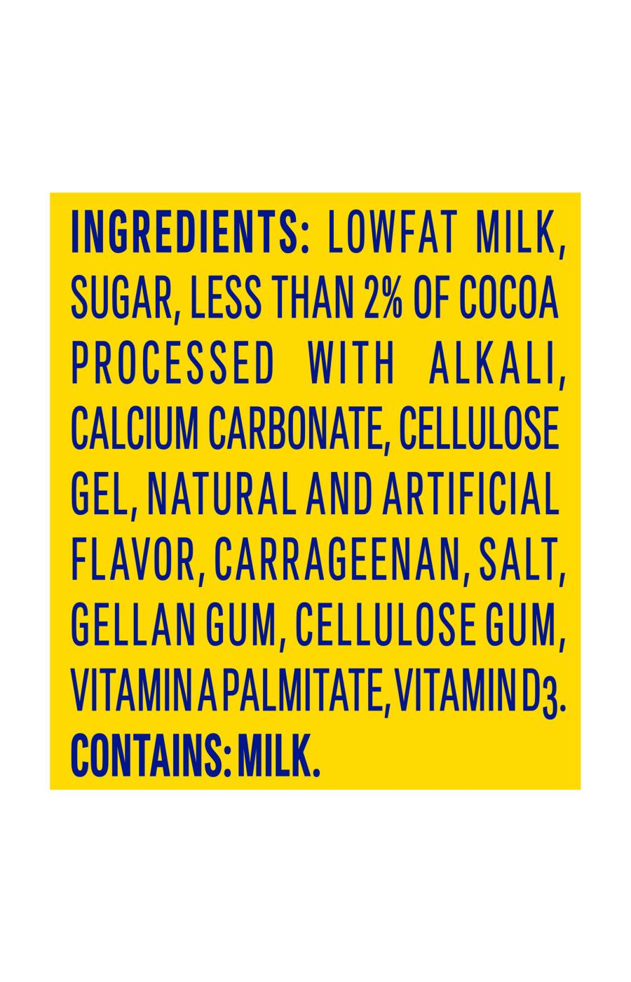 Lowfat Milk, Sugar, Less Than 2% Of Cocoa Processed With Alkali, Calcium Carbonate, Cellulose Gel, Natural And Artificial Flavor, Carrageenan, Salt, Gellan Gum, Cellulose Gum, Vitamin A Palmitate, Vitamin D3.Allergens and safety warnings