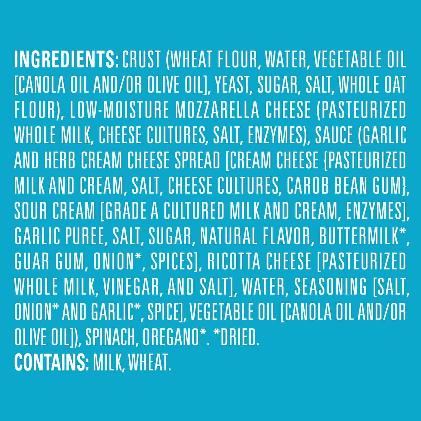 Crust (Wheat Flour, Water, Vegetable Oil [Canola Oil and/or Olive Oil], Yeast, Sugar, Salt, Whole Oat Flour), Sauce (Water, Seasoning [Milk, Corn Starch, Salt, Garlic*, Onion*, Soybean Oil, Less than 2% of Spices, Cane Sugar, Whey, Butter, Natural Flavors]), Low-Moisture Mozzarella Cheese (Pasteurized Whole Milk, Cheese Cultures, Salt, Enzymes), Spinach, Oregano*. * Dried.Allergens and safety warnings