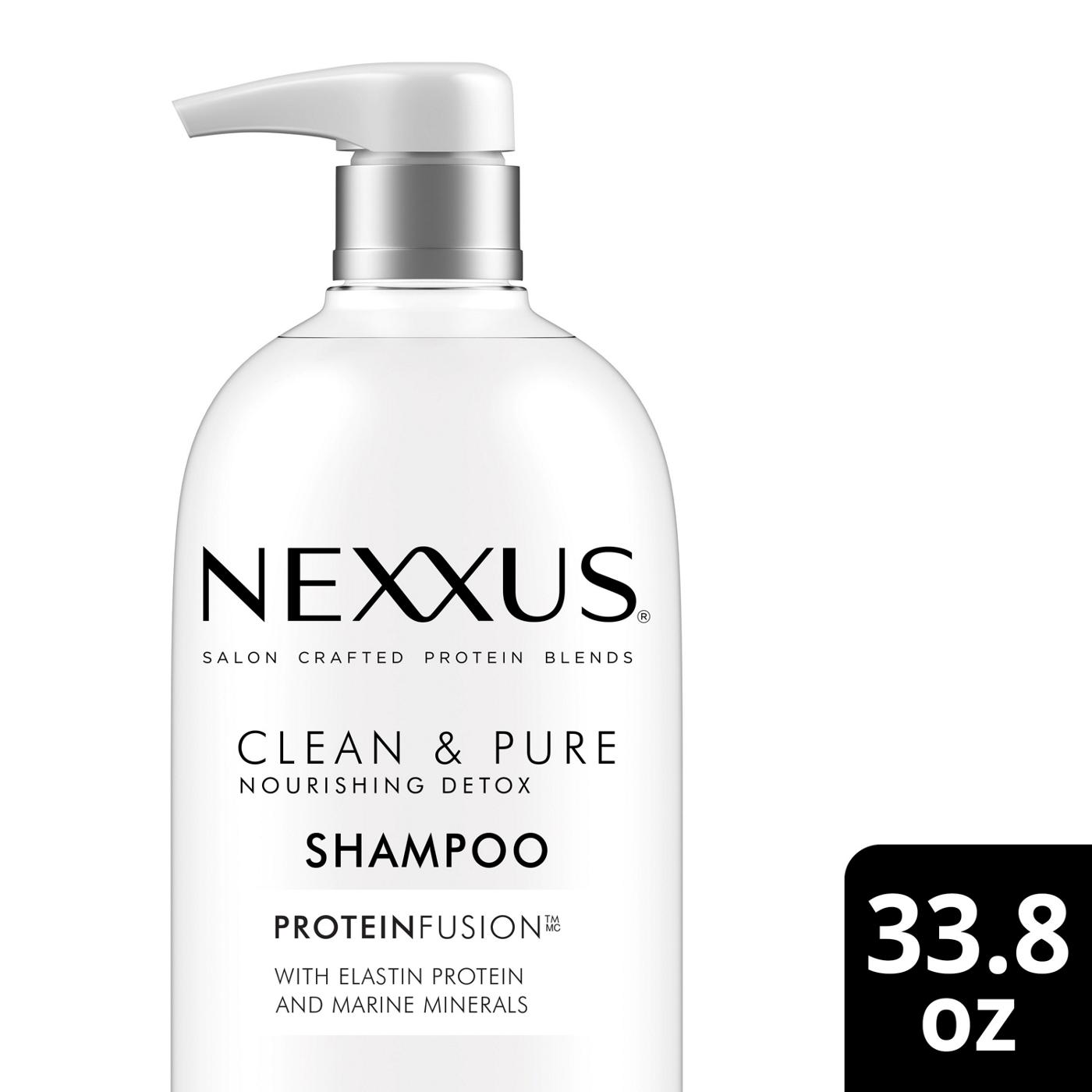 Want a shampoo that leaves hair deeply nourished, soft, smooth and strong? Discover Nexxus Clean & Pure Shampoo. It cleanses and detoxifies hair while replenishing vital nutrients. Nexxus Clean & Pure hair products are packed with powerful ingredients to purify and revive your hair. Formulated to be silicone, dye and paraben free, this hydrating shampoo is gentle and safe to use every day. Salon-crafted with the exclusive ProteinFusion blend of elastin protein and marine minerals, this hair shampoo provides a deep clean while locking in moisture. Great for all hair types, you can unleash your hair's natural smoothness all day long. Repairing hair is a multi-step process that includes a combination of hair products. This clarifying shampoo goes well with Nexxus Clean & Pure Nourishing Detox Conditioner, Nexxus Clean & Pure Invigorating Detox Scalp Scrub, and Nexxus Clean & Pure Nourishing Detox 5in1 Invisible Hair Oil. For a deep detox, start your hair care routine with Clean & Pure Scalp Scrub to help remove impurities including product and oil build-up. Next, cleanse with Clean & Pure Shampoo. Last, smooth Nexxus Clean & Pure Conditioner onto wet hair and wait three minutes before rinsing thoroughly. Trust your beautiful, healthy hair to the power of Nexxus.
