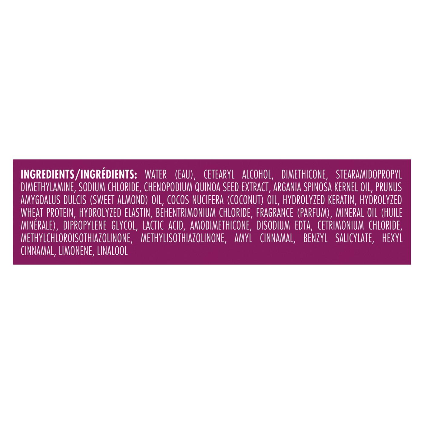 Water (Eau), Cetearyl Alcohol, Dimethicone, Stearamidopropyl Dimethylamine, Cocos Nucifera (Coconut) Oil, Chenopodium Quinoa Seed Extract, Prunus Amygdalus Dulcis (Sweet Almond) Oil, Argania Spinosa Kernel Oil, Hydrolyzed Keratin, Collagen Amino Acids, Hydrolyzed Elastin, Fragrance (Parfum), Lactic Acid, Behentrimonium Chloride, Mineral Oil (Huile Minerale), Dipropylene Glycol, Amodimethicone, Citric Acid, Sodium Benzoate, Sodium Gluconate, Sodium Chloride, Disodium EDTA, Sodium Citrate, Cetrimonium Chloride, PEG-7 Propylheptyl Ether, Acrylamidopropyltrimonium Chloride/Acrylamide Copolymer, Amyl Cinnamal, Benzyl Salicylate, Hexyl Cinnamal, Limonene, Linalool.