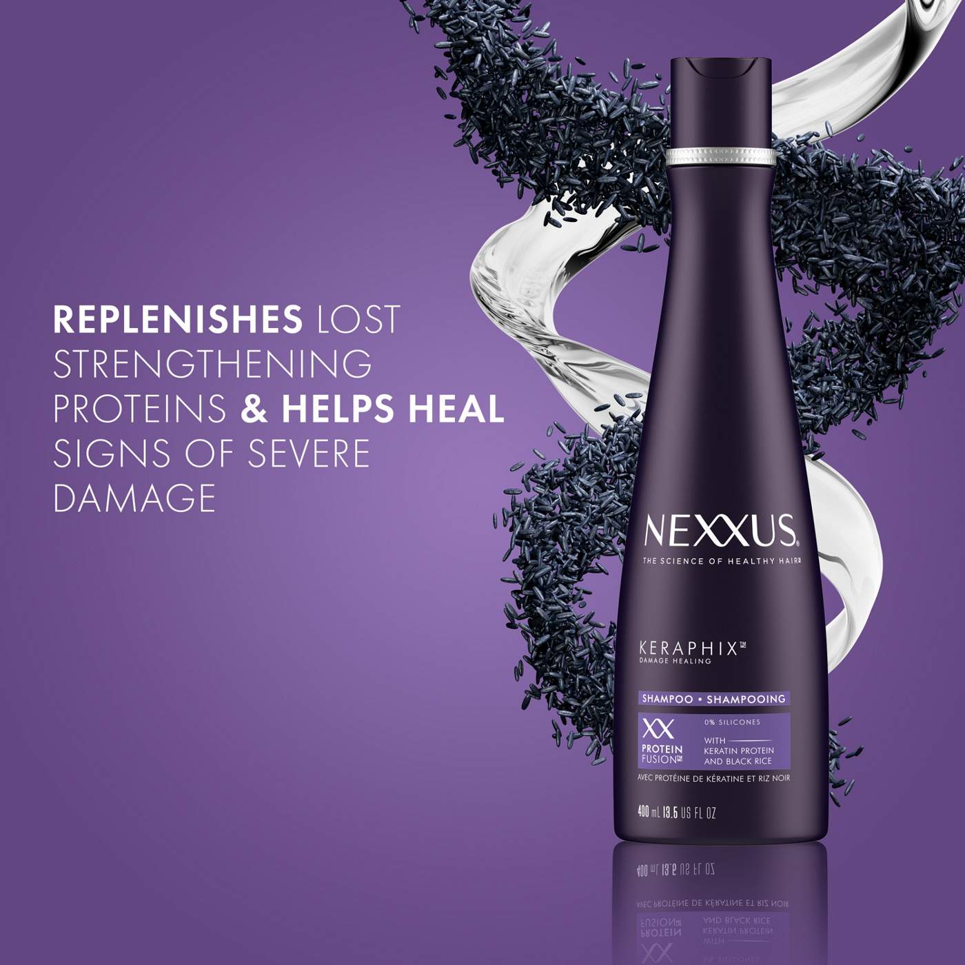 Hair is made up of protein. Every touch, every treatment, every style you love—it all rewrites your hair’s protein. When protein is damaged, hair’s look and feel is compromised. That’s why Nexxus uses protein science not just to repair hair but to restore its ability to perform. It isn't about one perfect hair day. It's about a lifetime of healthy hair, built strand by strand.\\Frequent heat styling and chemical processing can break down disulfide bonds and strip essential amino acids, leading to cuticle erosion and damage deep within the hair fiber. This makes strands weak, dull, tangled, harder to style, and less smooth and shiny. \\KERAPHIX, our extreme damage repair collection, is powered by KRT Keratin Resistance Therapy with liquid crystal serine amino acid to rebuild internal strength from inside out. Repair and resist visible damage from coloring, bleaching, highlighting, styling, heat and more with 24X stronger hair* restored to be as strong as virgin hair**. This shampoo for damaged hair provides deep moisture to revive dry, brittle strands and KRT technology seals the outer layer to restore elasticity—so hair is shiny, feels soft, resilient, and ready to bounce back with every style. \\Nexxus, the protein science behind powerful hair since 1979. *System vs. non-conditioning shampoo **Based on a breakage study on bleached treated hair with Keraphix Shampoo & Conditioner + Treatment vs. virgin hair.