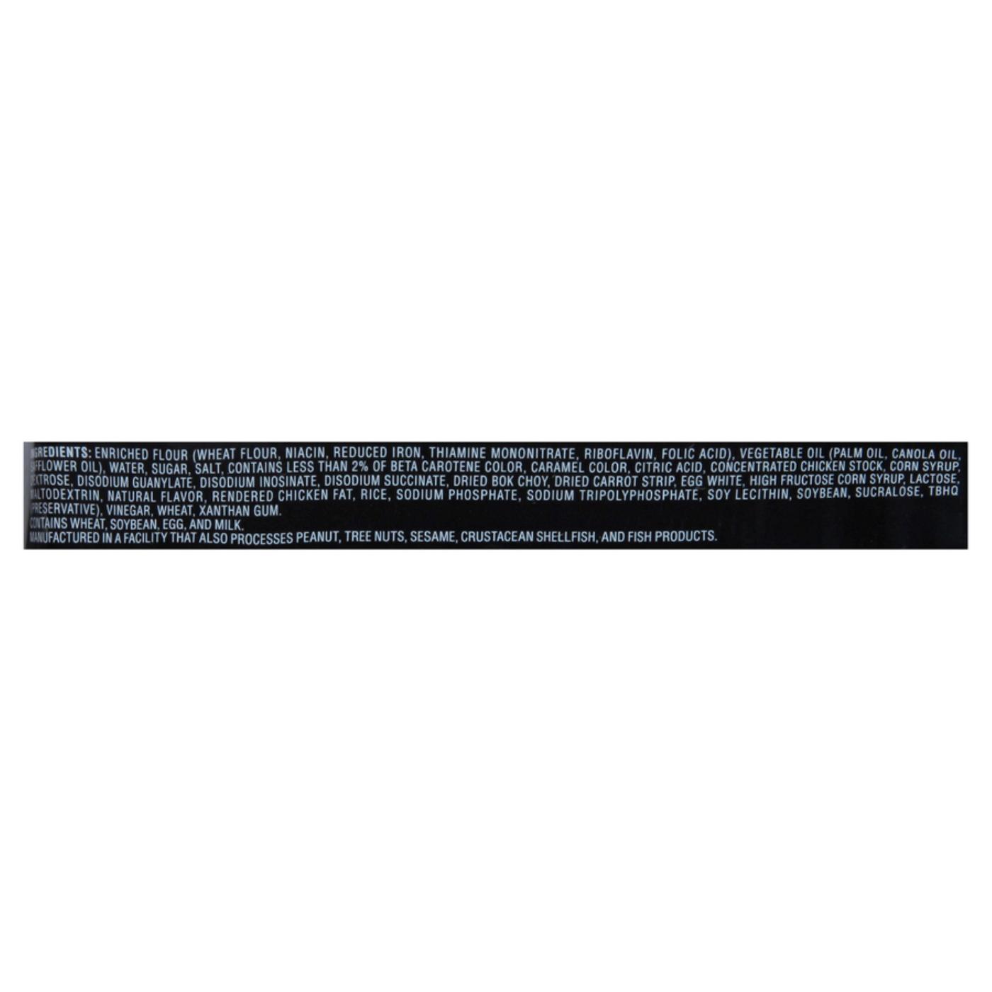Enriched Flour (Wheat Flour, Niacin, Reduced Iron, Thiamine Mononitrate, Riboflavin, Folic Acid), Vegetable Oil (Palm Oil, Canola Oil, Safflower Oil), Water, Sugar, Salt, Contains Less than 2% of Beta Carotene Color, Caramel Color, Citric Acid, Concentrated Chicken Stock, Corn Syrup, Dextrose, Disodium Guanylate, Disodium Inosinate, Disodium Succinate, Dried Bok Choy, Dried Carrot Strip, Egg White, High Fructose Corn Syrup, Lactose Maltodextrin, Natural Flavor, Rendered Chicken Fat, Rice, Sodium Phosphate, Sodium Tripolyphosphate, Soy Lecithin, Soybean, Sucralose, TBHQ (Preservative), Vinegar, Wheat, Xanthan Gum.