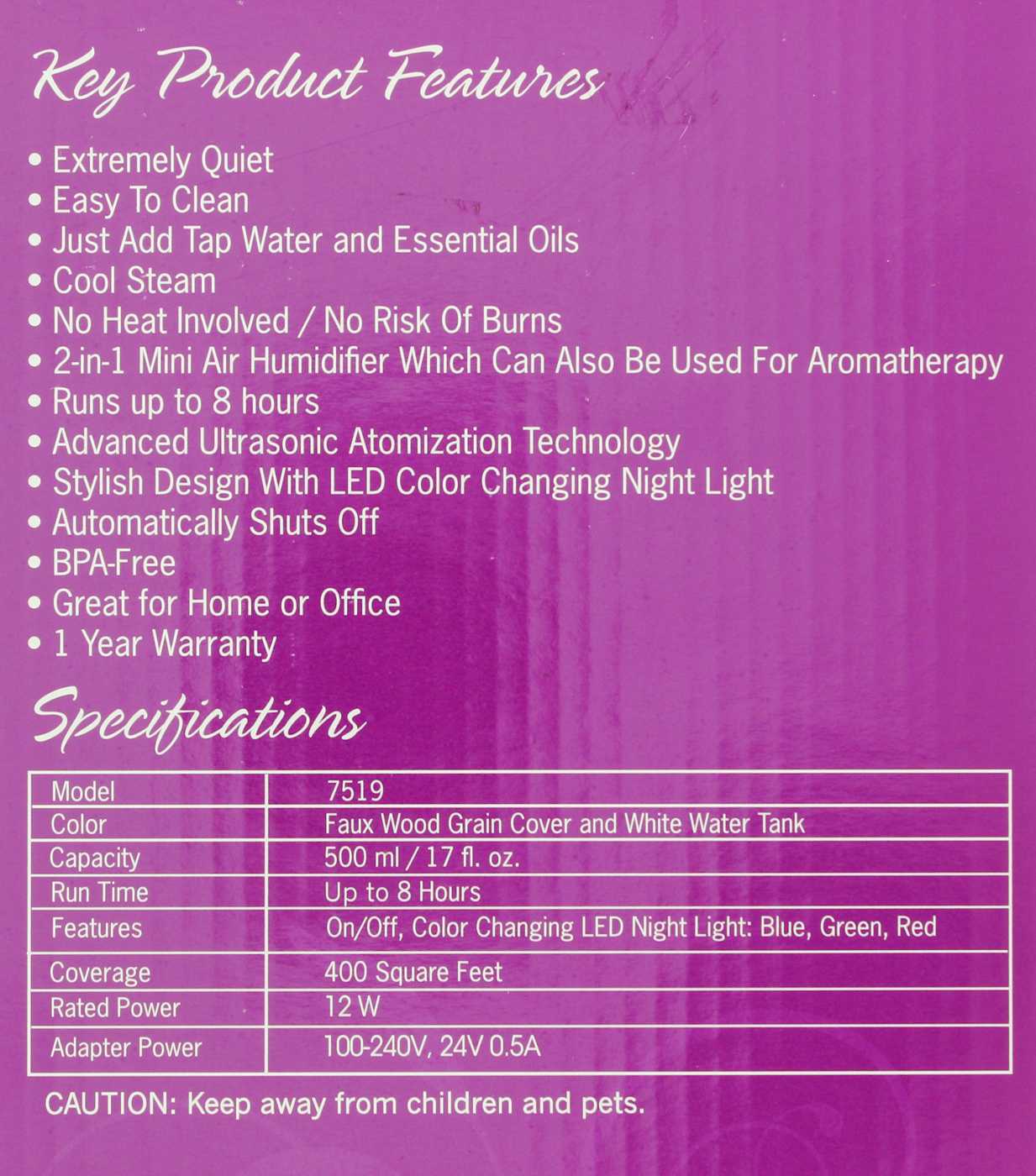 Just add 500 ml/17 fl. oz. of water and five drops of your favorite essential oils and enjoy. Add more drops for a stronger aroma. Diffuses up to eight hours then shuts off automatically.