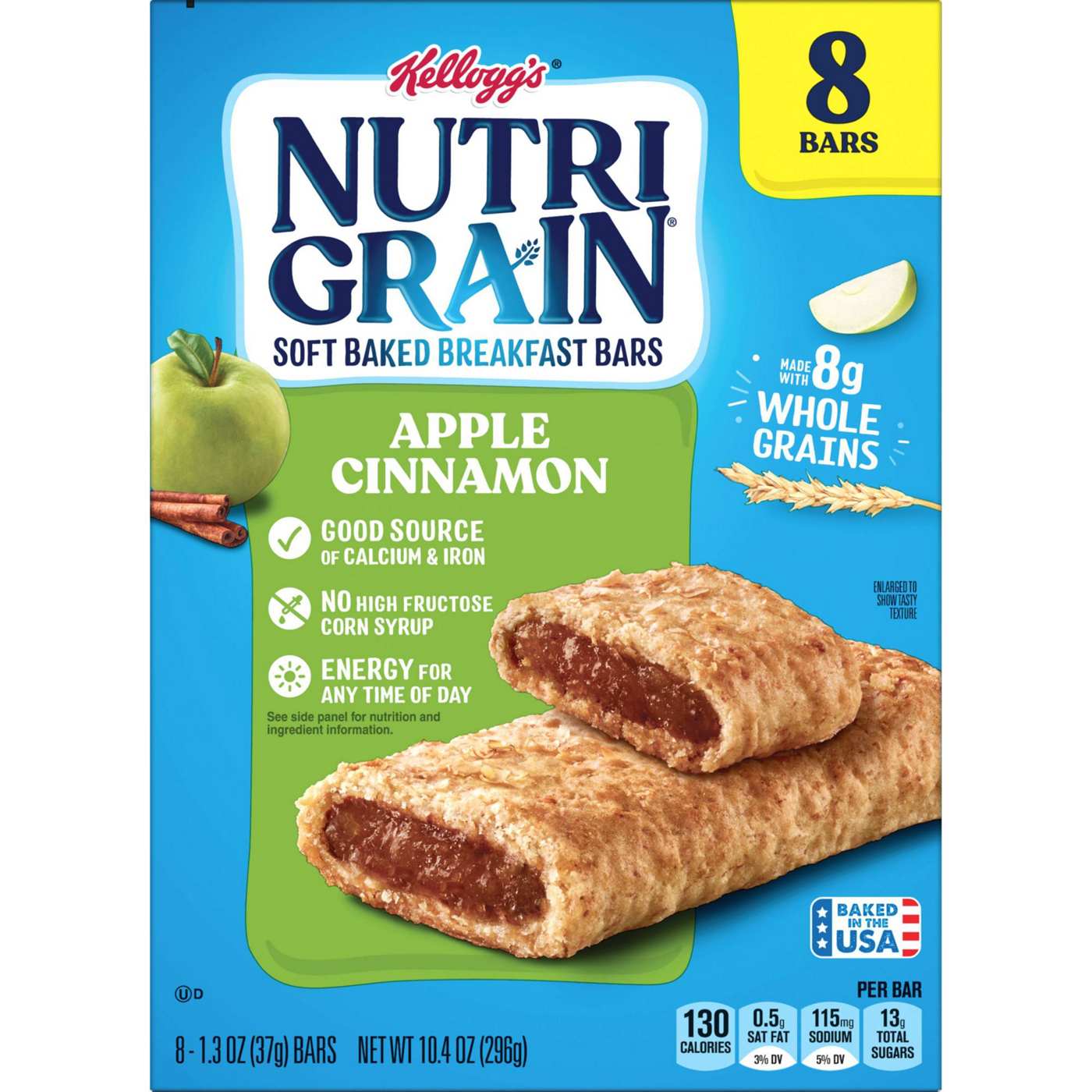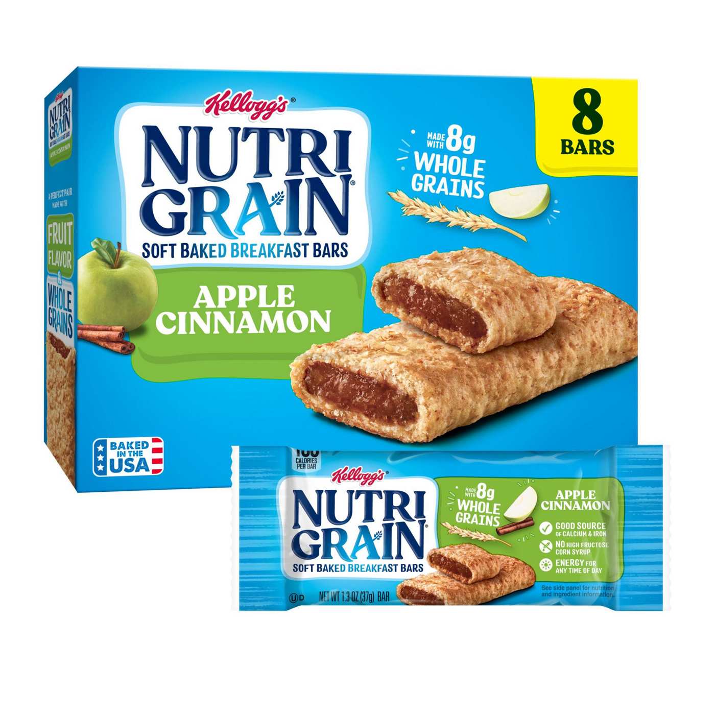 Come prepared for busy mornings with Nutri-Grain. These delicious and convenient apple cinnamon-flavored bars are a great start to any morning and help empower parents and kids to win the day. Made with 8g of whole grains, and a good source of calcium and iron, these breakfast bars provide energy for any time of day. Grab a pouch for the kids to eat at home in the morning; Pack a snack for the bus on the way to school. Nutri-Grain soft baked breakfast bars not only make a tasty addition to your morning, they're also a great choice for a kids snack any time of the day. With these convenient and perfectly baked snack bars, savvy parents and kids will feel prepared for whatever the day may bring.• Soft baked breakfast bars made with whole grains and tasty apple cinnamon flavor; Convenient addition to any balanced breakfast• Enjoy soft, chewy crust and fruit-flavored filling for on-the-go moments and energy for any time of day• Made with 8g of whole grains; Good source of calcium and iron; Kosher Dairy; Contains wheat, milk, and soy ingredients• Convenient and ideal for busy mornings; Stock your home pantry so you're always prepared; Pack in a backpack for school snacks or office snacks• Includes one, 10.4oz box containing eight ready-to-eat soft baked breakfast bars; Packaged for freshness and great taste• SNAP and EBT eligible item