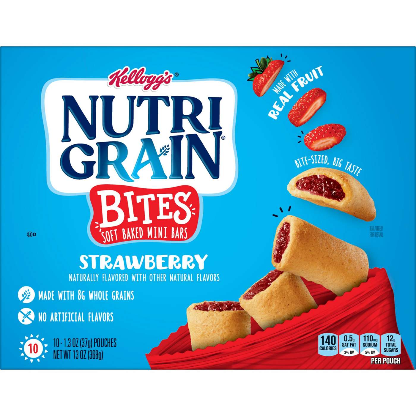 Nutri-Grain Bites Strawberry soft baked mini bars are a tasty, on-the-go snack that is perfect for any time of day. Kids will love the sweet strawberry flavor, and parents will feel great that they contain 8g of whole grain. These bite-size bars are packed into a portable pouch that is perfect for hungry adventurers. Pack in your kid's backpack or your tote along with other daily essentials. Nutri-Grain Bites are also ideal for picnics at the park, snacks in the car or as an after-school treat; Nutri-Grain Bites soft baked mini bars not only make a tasty addition to your morning, they're also a great choice for a kids snack any time of the day. No matter where you are, always come prepared with a pouch of Nutri-Grain Bites.• With whole grains and tasty strawberry flavor, these mini bars make a perfectly portable addition to any balanced breakfast• Bite-sized with a soft, chewy crust and a sweet, strawberry-flavored filling for feel-good mornings• Good source of eight vitamins and minerals; Made with 8g whole grains; No artificial flavors; Kosher Dairy; Contains wheat, milk, and soy ingredients• Convenient, travel-ready, and ideal for on-the-go moments and busy mornings; Pack in a lunch box, for school snacks, or office snacks• Includes one, 13oz box containing 10, 1.3oz pouches of Nutri-Grain Bites Strawberry soft baked mini bars; Packaged for freshness and great taste• SNAP and EBT eligible item