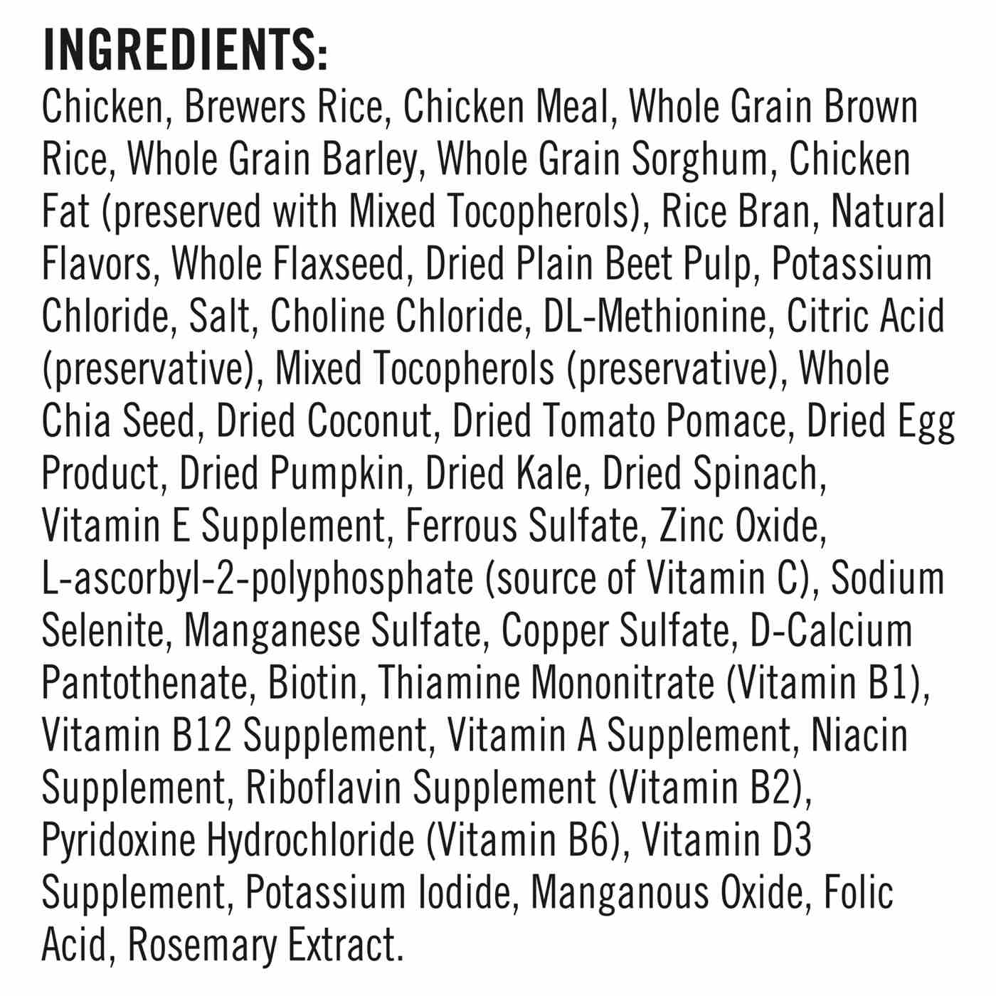 Chicken, Brewers Rice, Chicken Meal, Whole Grain Brown Rice, Whole Grain Barley, Whole Grain Sorghum, Chicken Fat (preserved with Mixed Tocopherols), Rice Bran, Natural Flavors, Whole Flaxseed, Dried Plain Beet Pulp, Potassium Chloride, Salt, Choline Chloride, DL-Methionine, Citric Acid (preservative), Mixed Tocopherols (preservative), Whole Chia Seed, Dried Coconut, Dried Tomato Pomace, Dried Egg Product, Dried Pumpkin, Dried Kale, Dried Spinach, Vitamin E Supplement, Ferrous Sulfate, Zinc Oxide, L-ascorbyl-2-polyphosphate (source of Vitamin C), Sodium Selenite, Manganese Sulfate, Copper Sulfate, D-Calcium Pantothenate, Biotin, Thiamine Mononitrate (Vitamin B1), Vitamin B12 Supplement, Vitamin A Supplement, Niacin Supplement, Riboflavin Supplement (Vitamin B2), Pyridoxine Hydrochloride (Vitamin B6), Vitamin D3 Supplement, Potassium Iodide, Manganous Oxide, Folic Acid, Rosemary Extract.Allergens and safety warnings