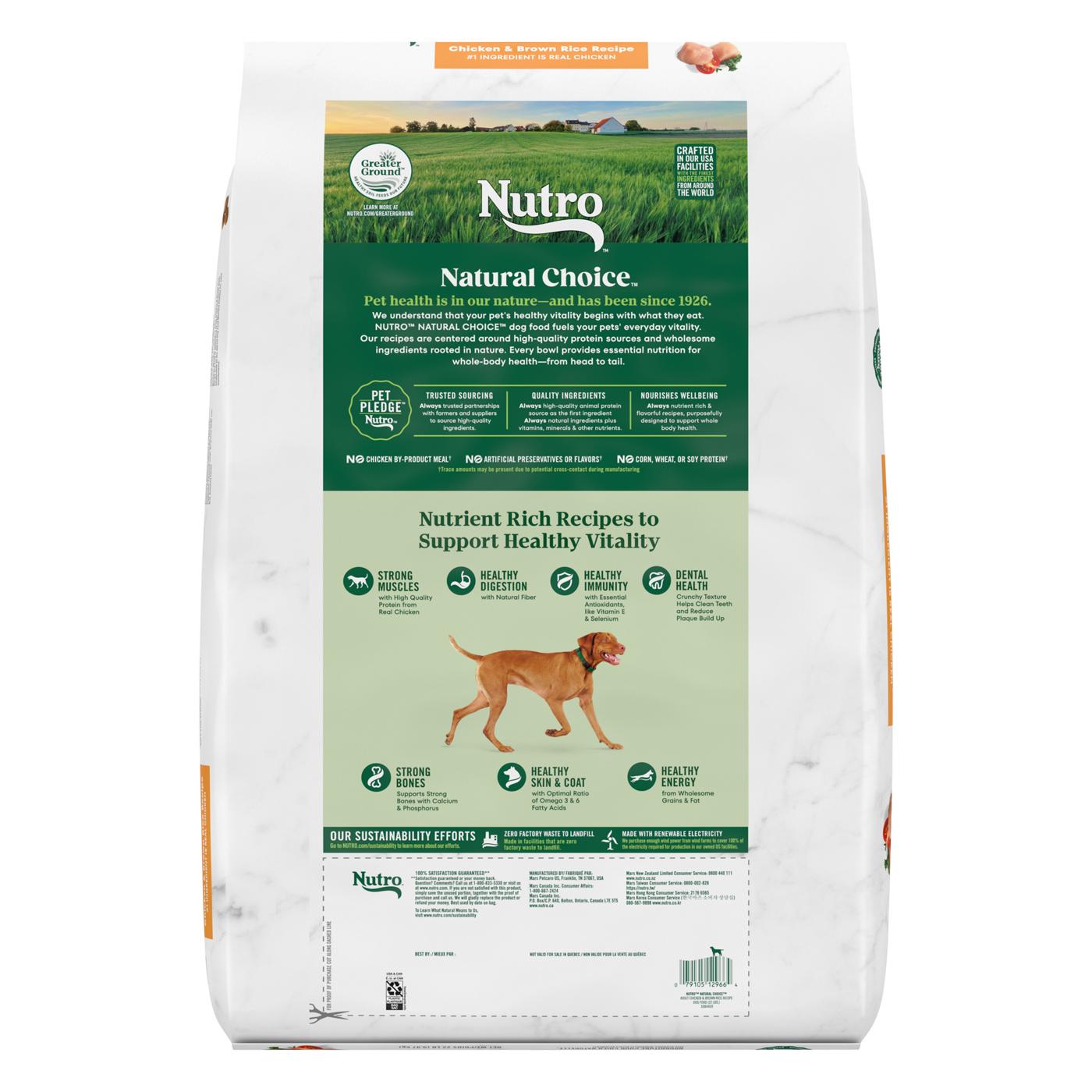 We understand that pet owners want the best for their dogs. That’s why Nutro has a partnership with trusted farmers and suppliers to source high-quality ingredients, giving your dog quality nutrition both you and your pet will appreciate. Made with chicken as the #1 ingredient, and crafted with vitamins, minerals, and other nutrients, Nutro Natural Choice Adult Dry Dog Food, Chicken & Brown Rice Recipe brings real, recognizable ingredients to every mealtime. Made with a crunchy texture that helps clean teeth and reduce plaque buildup, this dry dog food promotes your dog’s dental health. Plus, it's made with non-GMO ingredients and has no chicken by-product meal, corn, wheat, or soy. With ingredients that promote healthy skin and coat, digestion, and immunity, this dry dog food recipe also supports your dog’s vitality. Packed with delicious flavor, high quality ingredients, and supportive benefits, serve your furry loved one something they will love with Nutro Natural Choice Dry Dog Food Recipes.Made With Real Chicken: This dry dog food recipe is made with real chicken as the #1 ingredient in this protein-rich recipe.Quality Recipe: This dry dog food recipe is made with non-GMO ingredients; no chicken by-product meal, corn, wheat, or soy.Supports Vitality: Nutro Natural Choice Adult Dry Dog Food promotes healthy vitality by supporting healthy skin & coat, healthy digestion, and immunity for your dog.Key Benefits: Nutro Natural Choice Adult Dry Dog Food, Chicken & Brown Rice Recipe supports healthy energy, strong bones, and strong muscles.Contains One (1) 22 lb. Bag of Nutro Natural Choice Adult Dry Dog Food, Chicken & Brown Rice Recipe.Fine Ingredients: This dry dog food recipe is crafted in our USA facilities with the finest ingredients from around the world.