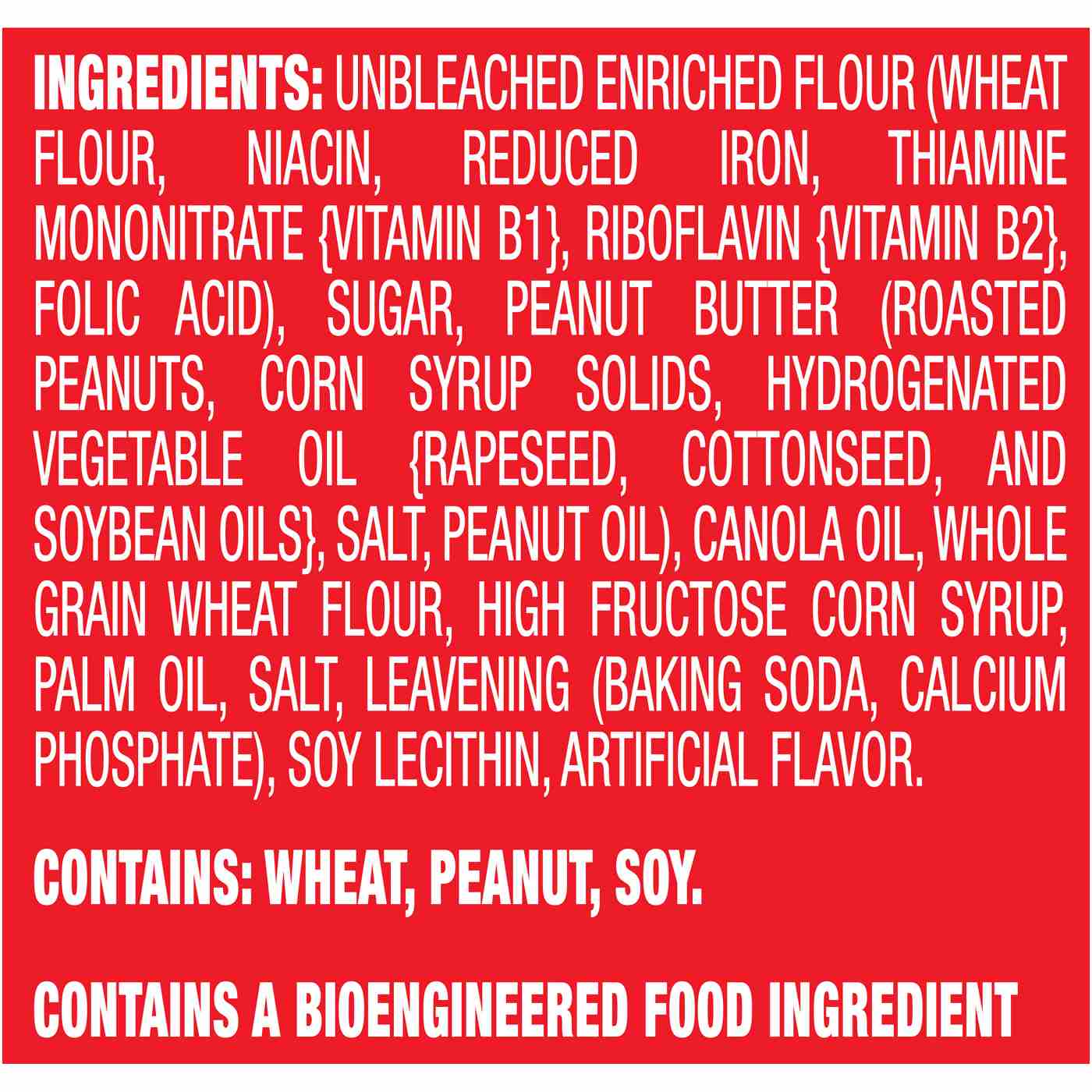 Unbleached Enriched Flour (Wheat Flour, Niacin, Reduced Iron, Thiamine Mononitrate {Vitamin B1}, Riboflavin {Vitamin B2}, Folic Acid), Sugar, Peanut Butter (Roasted Peanuts, Corn Syrup Solids, Hydrogenated Vegetable Oil {Rapeseed, Cottonseed, And Soybean Oils}, Salt, Peanut Oil), Soybean And/Or Canola Oil, Whole Grain Wheat Flour, High Fructose Corn Syrup, Palm Oil, Salt, Leavening (Baking Soda, Calcium Phosphate), Soy Lecithin, Artificial Flavor.Contains: Wheat, Peanut, Soy.Allergens and safety warnings