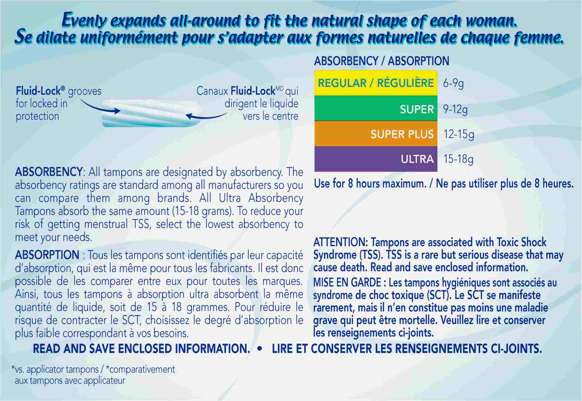 Fluid-Lock grooves for leak protection. Less waste*. Only what you need nothing you don't. Evenly expands all-around to fit the natural shape of each woman. Fluid-lock grooves for locked in protection. Absorbency: All tampons are designated by absorbency. The absorbency ratings are standard among all manufacturers so you can compare them among brands. All Ultra Absorbency tampons absorb the same amount (15-18 grams). To reduce your risk of getting menstrual TSS, select the lowest absorbency to meet your needs. Absorbency: Regular: 6-9 g; Super: 9-12 g; Super Plus: 12-15 g; Ultra: 15-18 g.