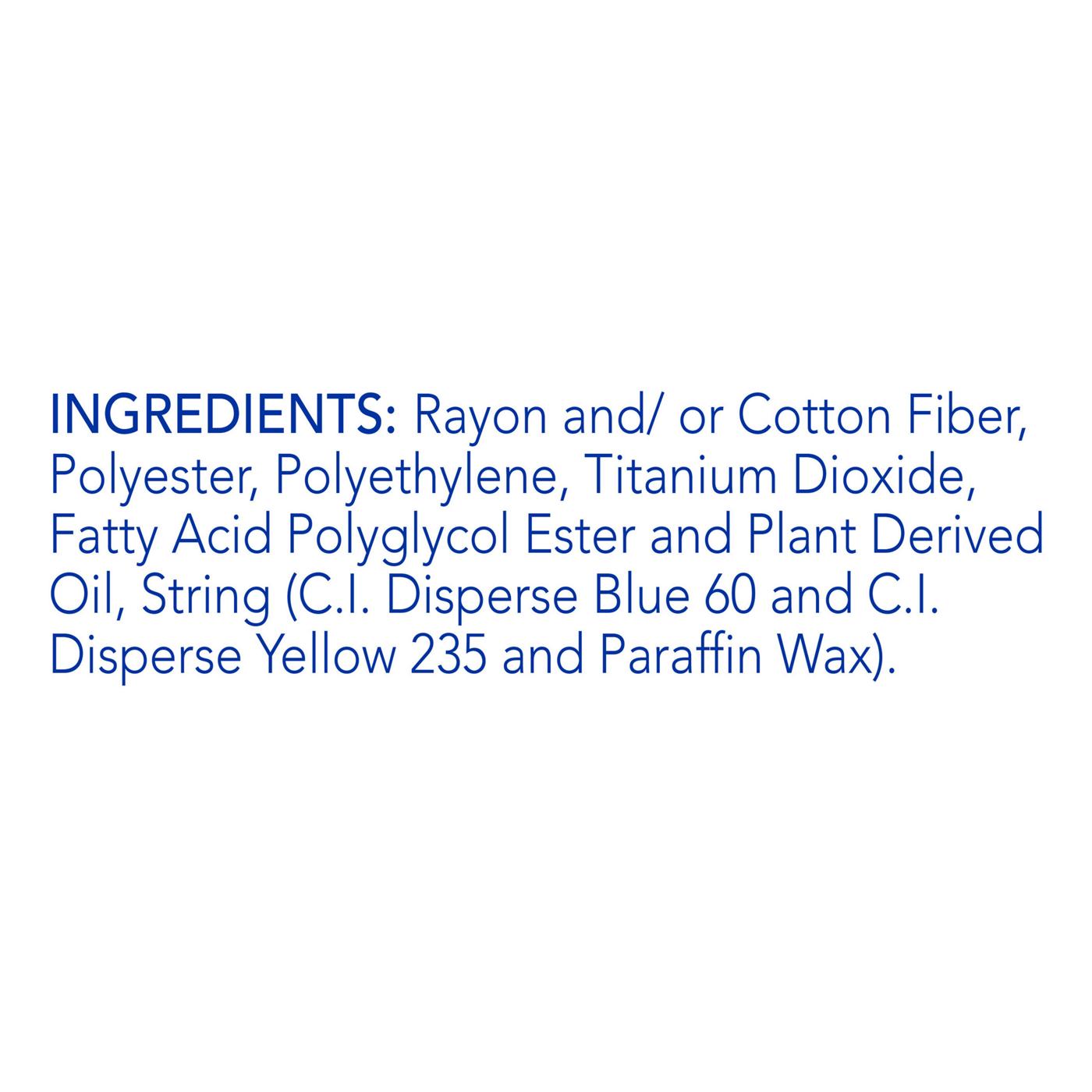 Inactive Ingredients: Rayon, Cellulose, Polyester, Polyethylene terephthalate, Cotton, Polyethylene, Titanium Dioxide, PEG-100 Stearate, Paraffin Wax, Dipotassium Phosphate, Ethoxylated Fatty Acid Esters, C.I. Vat Red 10, C.I. Vat Orange 15, C.I. Vat Green 1Allergens and safety warnings