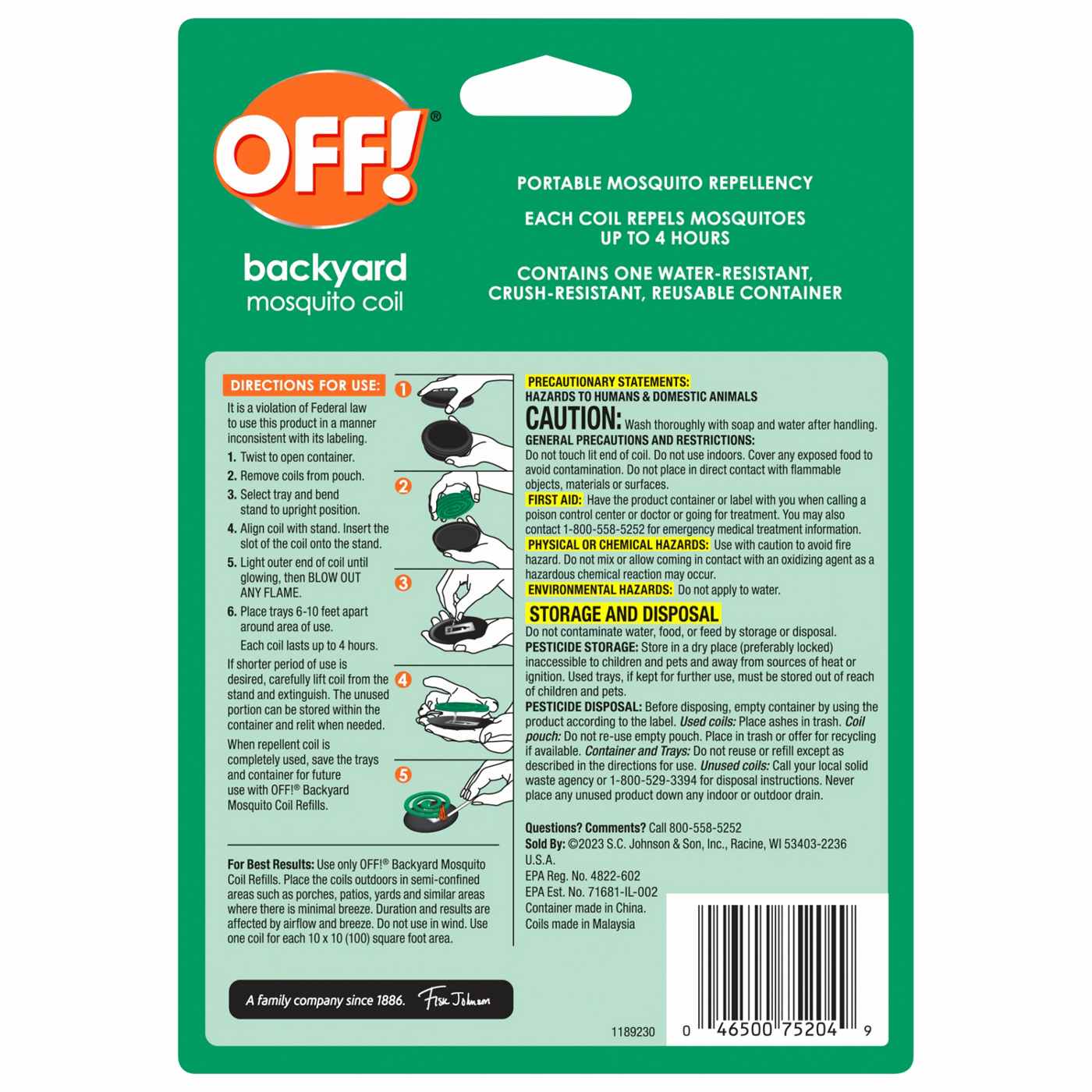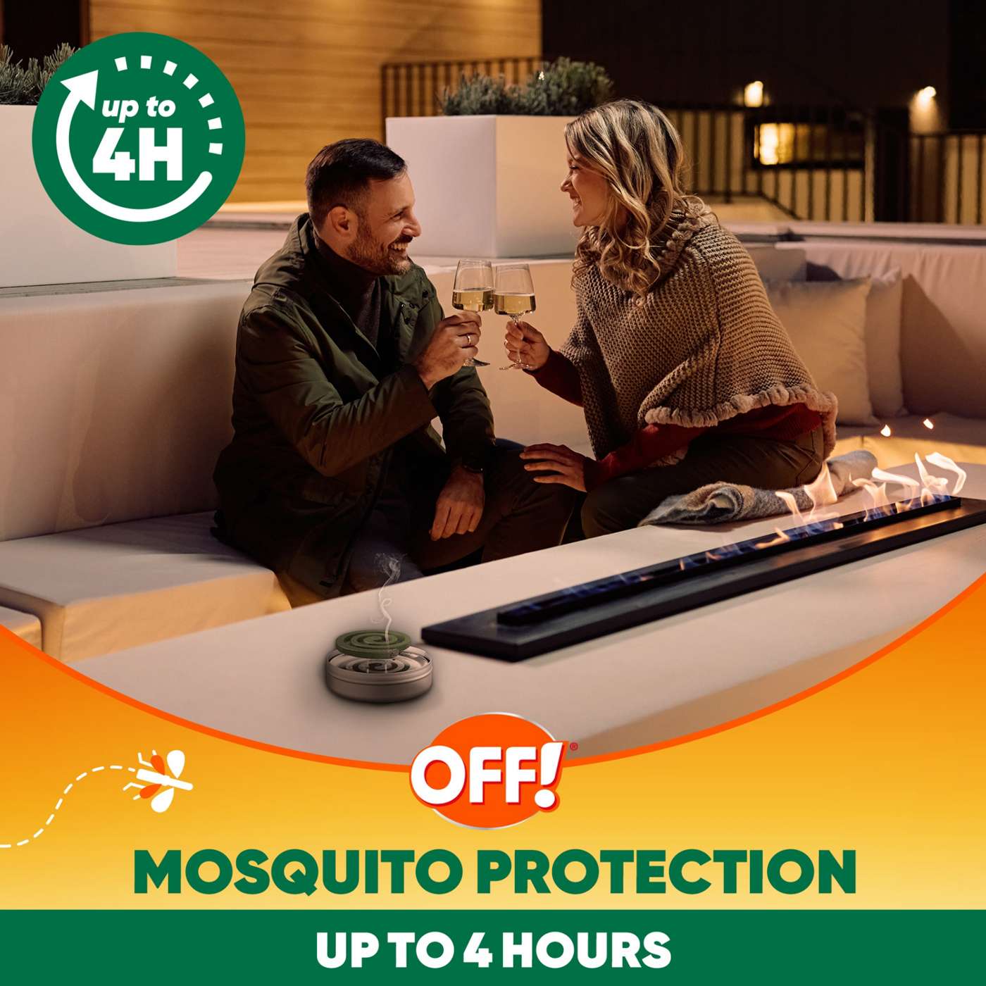 OFF! Mosquito Repellent Coil provides up to four hours of protection from mosquitoes. Works in semi-confined areas such as porches, patios and other areas where there is minimal breeze.