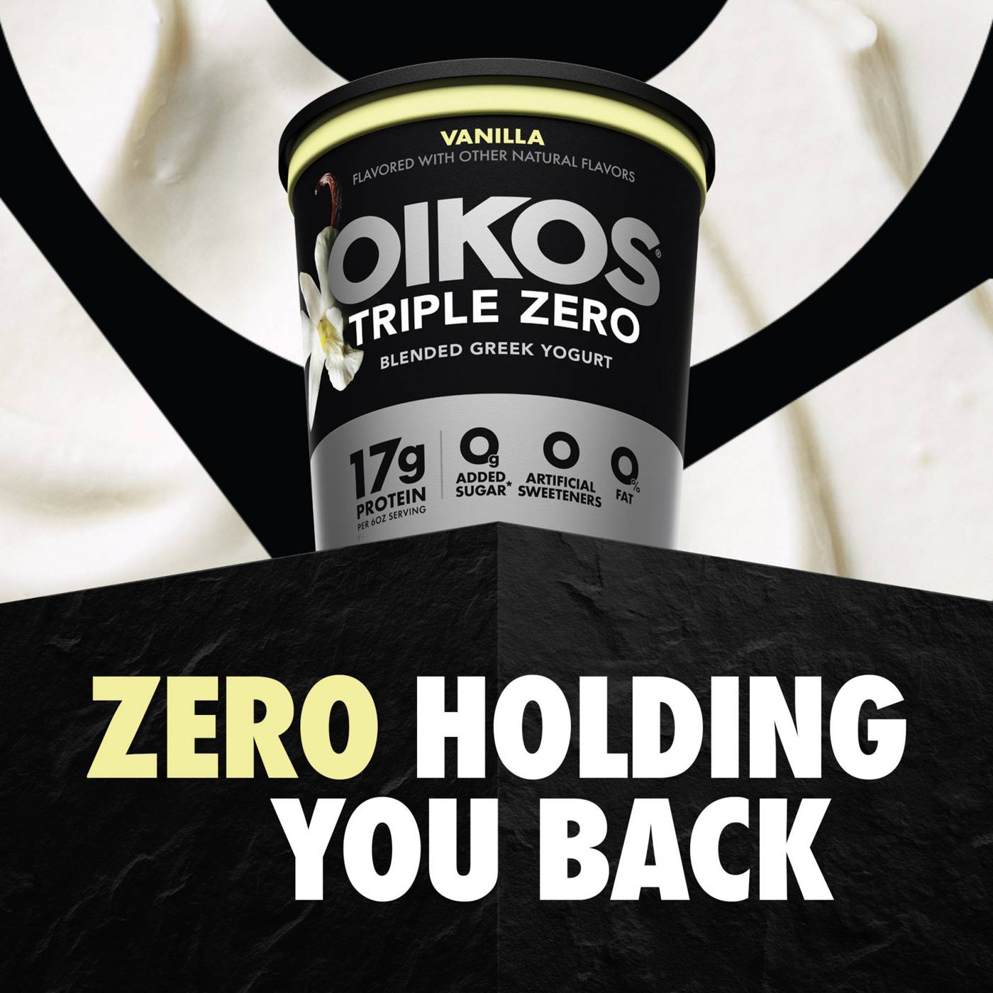 Enjoy epic tastes with Oikos Triple Zero Nonfat Vanilla Greek Yogurt, the delicious nonfat Greek yogurt tub with more of what you want and less of what you don’t. Each Oikos Triple Zero yogurt tub contains 0% fat, 0g added sugar* per 6 oz serving and 0 artificial sweeteners. Our vanilla flavored Greek yogurt packs a punch with 17 grams of protein per 6 oz serving, so you can always have dependable, high protein snacks with zero holding you back. Because when you feel strong, you are unstoppable. With protein and deliciousness, this high protein yogurt can help you strive to reach your potential. Pack a Greek vanilla yogurt serving for days that start at a sprint and enjoy a delicious boost of protein at lunch. Or throw in your favorite fruit or toppings for an extra refreshing snack. For even more reasons to go Greek, try Oikos Pro with 20g of protein per 5.3 oz serving or Oikos Blended with chunks of real fruit. Oikos Greek yogurt — Stronger Makes Everything Better.