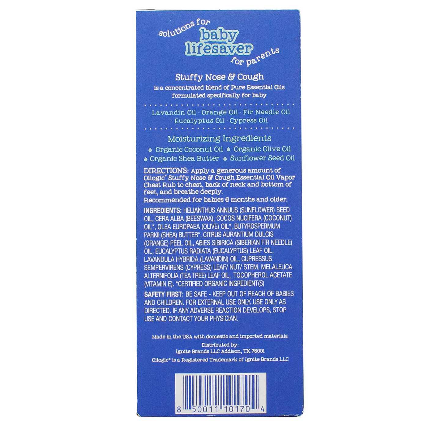 Solutions for Baby. Lifesaver for Parents. Oilogic Stuffy Nose & Cough Essential Oil Vapor Chest Rub is a concentrated blend of 100% Pure Essential Oils and plant-based moisturizing ingredients. Our Vapor Chest Rub is specifically formulated for babies 6 months+. The product is menthol-free and comes packaged in a mess free stick that easily applies to baby's chest.