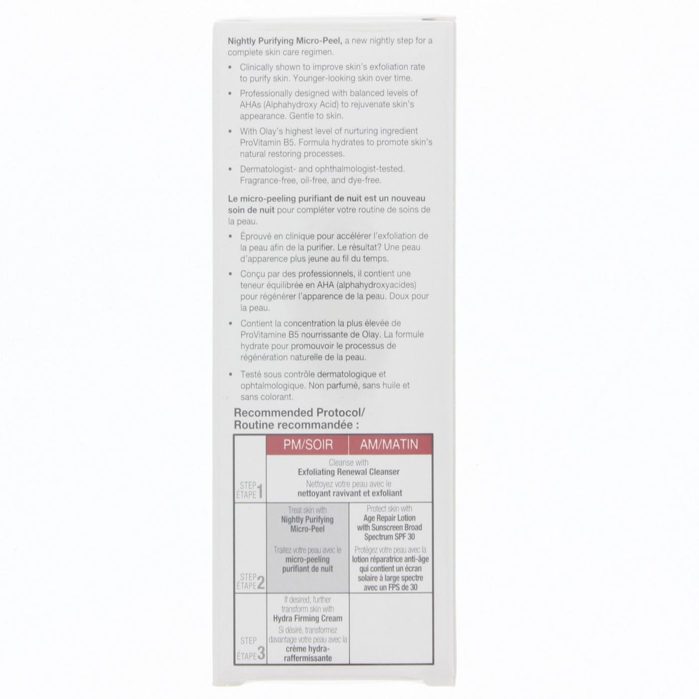 Refine your skin's texture with the Olay ProX Anti-Aging Nightly Purifying Micro-Peel. This specialized treatment is designed to work overnight as part of your evening skincare regimen. Its formula gently purifies the skin's surface, improving clarity and appearance over time.• Gentle exfoliating action helps to resurface skin while you sleep• Works to lift away dull, dead skin cells for improved radiance• Helps diminish the appearance of fine lines and uneven texture• Prepares skin to better absorb your morning skincare products