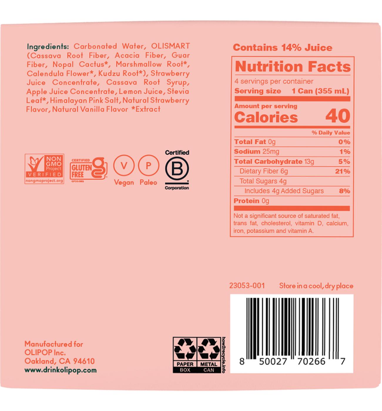 Carbonated Water, Olismart (Cassava Root Fiber, Acacia Fiber, Guar Fiber, Nopal Cactus*, Marshmallow Root*, Calendula Flower*, Kudzu Root*), Strawberry Juice Concentrate, Cassava Root Syrup, Apple Juice Concentrate, Lemon Juice, Stevia Leaf*, Himalayan Pink Salt, Natural Strawberry Flavor, Natural Vanilla Flavor. *Extract.