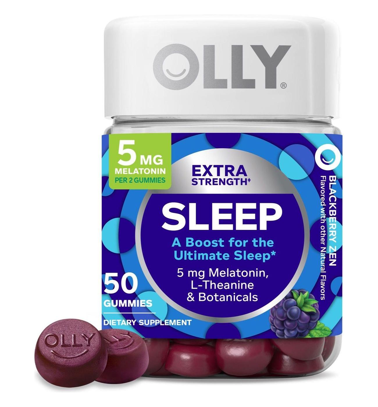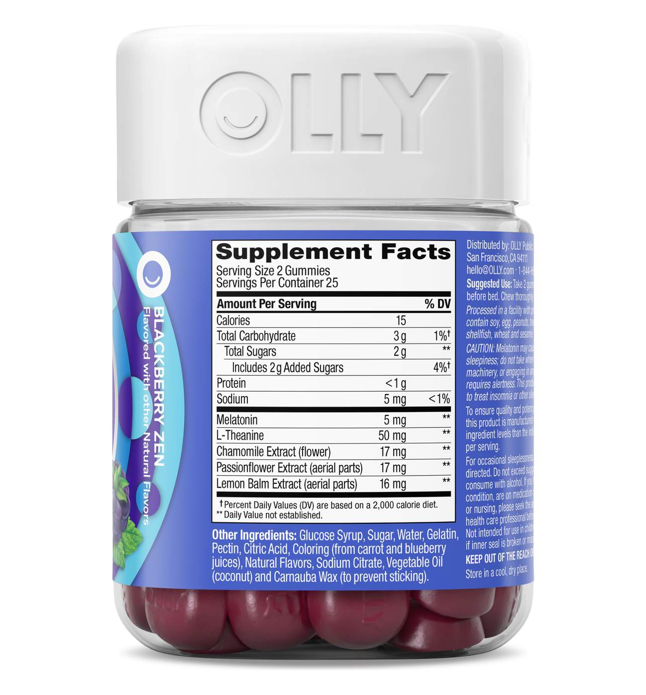 OLLY Extra Strength Sleep gummies are there for you when you need a boost to help you fall asleep & stay asleep.* Sometimes you just need a little something extra to help you drift off. These little gummies go big on sleep benefits. 5 mg of Melatonin, a sleepy time superstar ingredient, helps lull you to sleep. L-Theanine encourages relaxation so you can drift off.* With a blend of traditionally used botanical extracts: Chamomile, Passionflower & Lemon Balm. These gummies are a delightful addition to your routine. Take 2 gummies 30 minutes before bed, chew thoroughly before swallowing. Flavored with Blackberry and a hint of mint flavor and other natural flavors. Formulated with no synthetic flavors or colors and gluten free. *These statements have not been evaluated by the Food and Drug Administration. This product is not intended to diagnose, treat, cure or prevent any disease.CAUTION: Melatonin may cause drowsiness or sleepiness; do not take when driving, operating machinery, or engaging in any activity that requires alertness. This product is not intended to treat insomnia or other sleep disorders. To ensure quality and potency through expiration, this product is manufactured with higher active ingredient levels than the indicated amount per serving. For occasional sleeplessness. Take only as directed. Do not exceed suggested use. Do not consume with alcohol. If you have a medical condition, are on medication or are pregnant or nursing, please seek the advice of a qualified health care professional before using. Not intended for use in children.•OLLY EXTRA STRENGTH SLEEP GUMMIES: These gummies are expertly formulated for the ultimate night's sleep—5 mg Melatonin and L-Theanine help you find that sweet slumber when you need a little something extra to help you drift off*• THE GOODS INSIDE: L-Theanine encourages relaxation while a bonus boost of Melatonin helps you fall asleep and stay asleep.* These gummies include traditionally used botanical extracts: Chamomile, Passionflower & Lemon Balm• HOW TO TAKE: Take 2 gummies 30 minutes before bed, chew thoroughly before swallowing• DELIGHTFULLY TASTY: These Extra Strength Sleep gummies come in Blackberry Zen flavor with a hint of mint and other natural flavors• A SIMPLE PART OF YOUR ROUTINE: These gummies are gluten free & formulated with no synthetic flavors or colors• FIND MORE OLLY GOODNESS: We create products that are just as effective as they are delightful—gummies, multivitamins, premium softgels and more ways to help you feel happy inside out• NEW NEWS: We’ve made improvements to the taste and texture of our products—with the same OLLY goodness inside each gummy